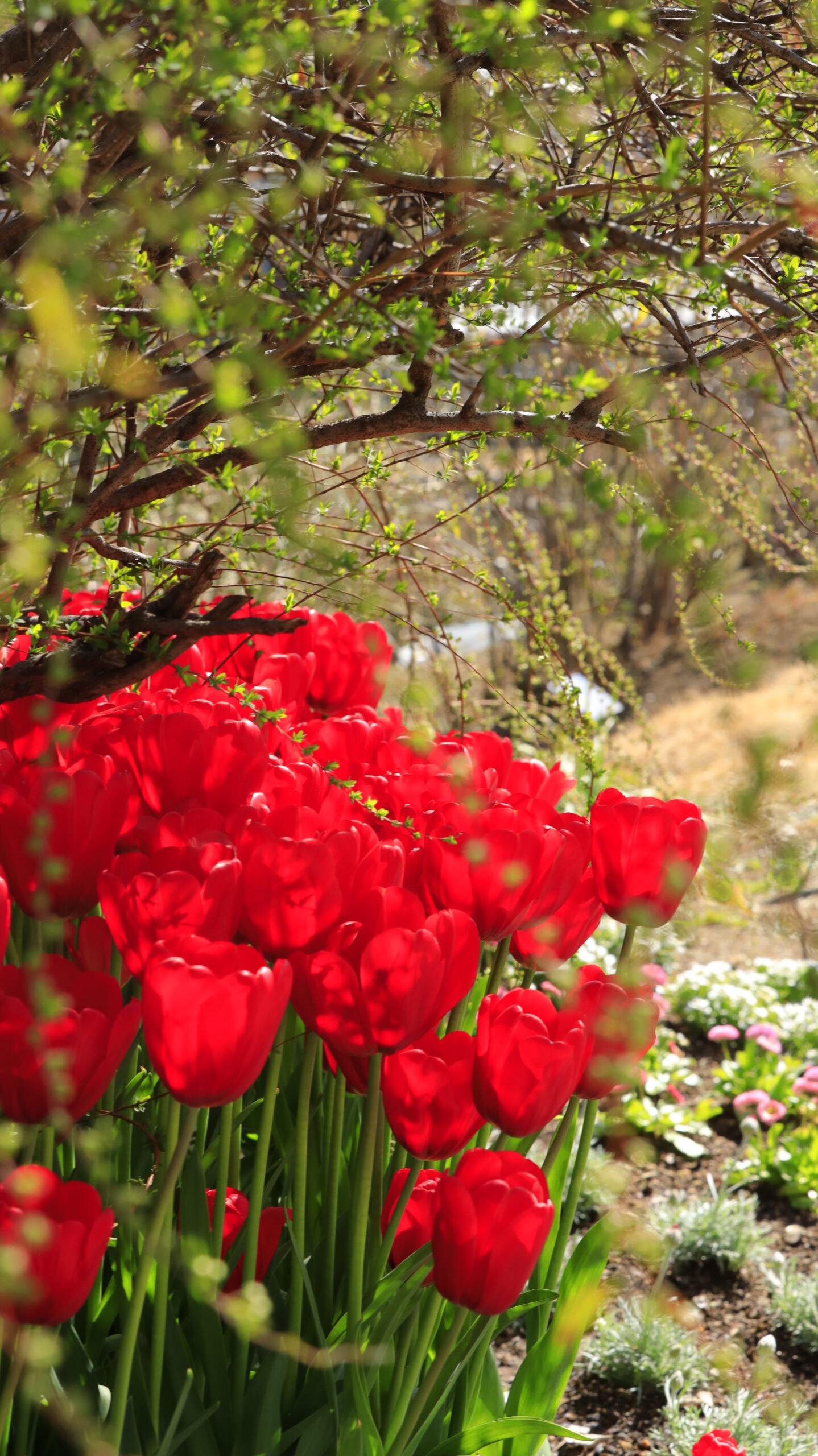 この写真は、あしかがフラワーパークで、草の下に咲く真っ赤なチューリップを横からの視点で撮影し、花の形と色の鮮やかさを強調したものです。