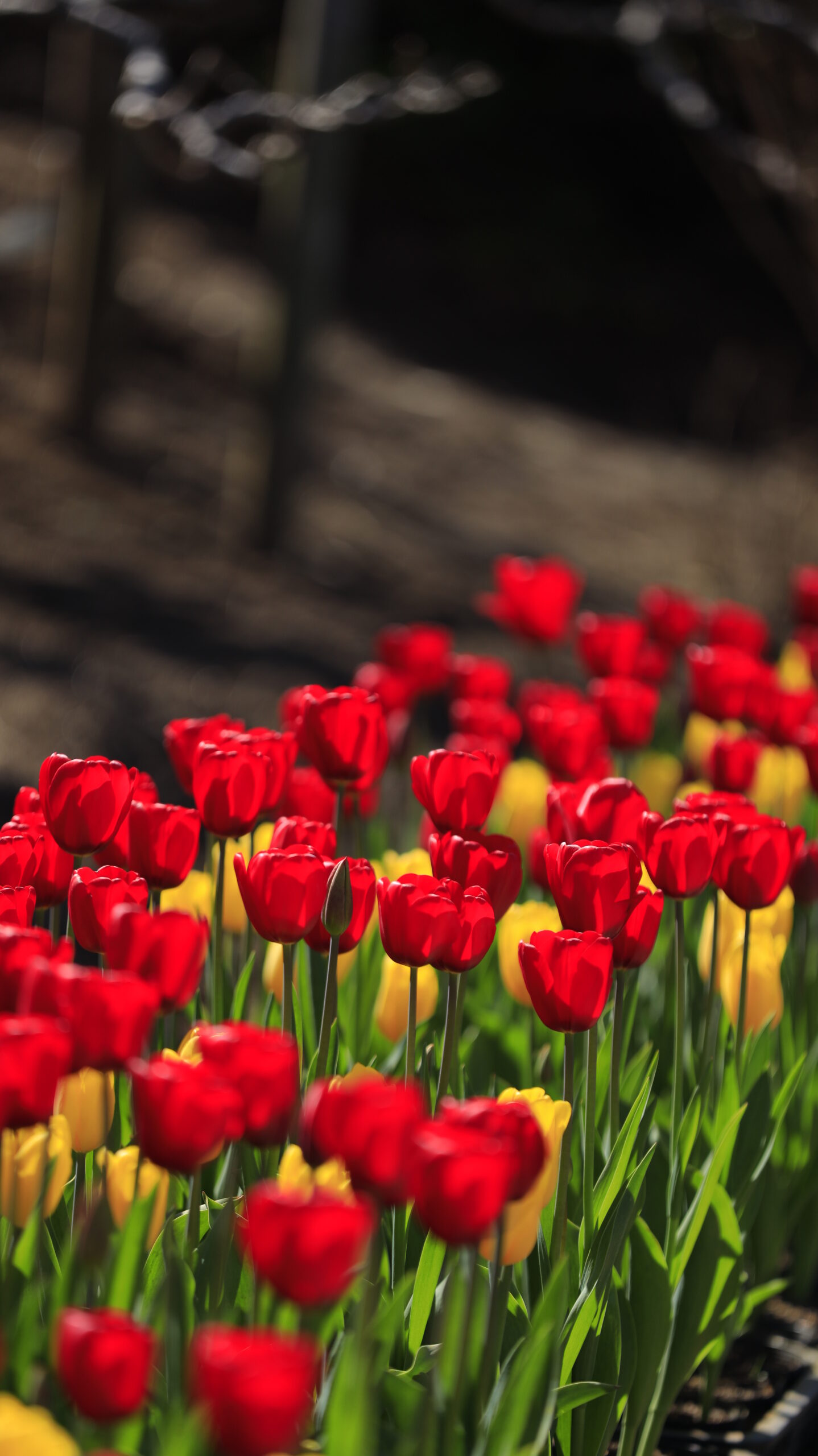 この写真は、あしかがフラワーパークで、真っ赤なチューリップに光が当たり、背の低い黄色のチューリップがアクセントとして映る様子を撮影したものです。