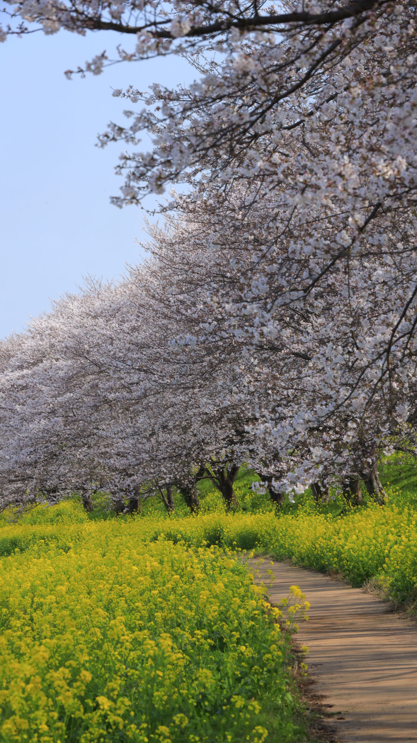 This photo was taken at Sakura Tsutsumi Park using a telephoto lens to emphasize the rows of cherry trees and rape blossoms with a compression effect.