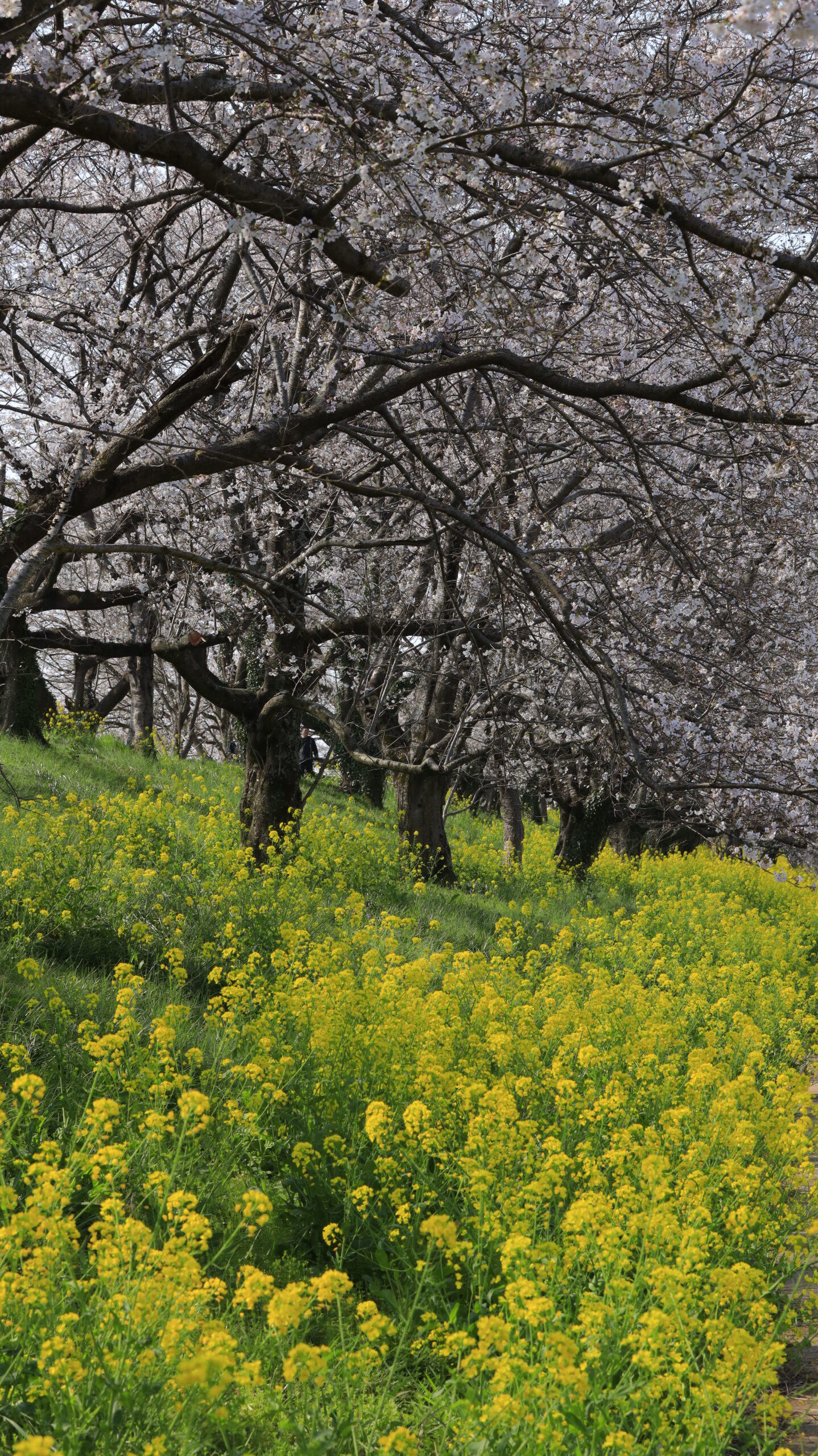 This photo was taken at Sakura Tsutsumi Park to capture the rows of cherry trees and rape blossoms from among the rape blossoms.