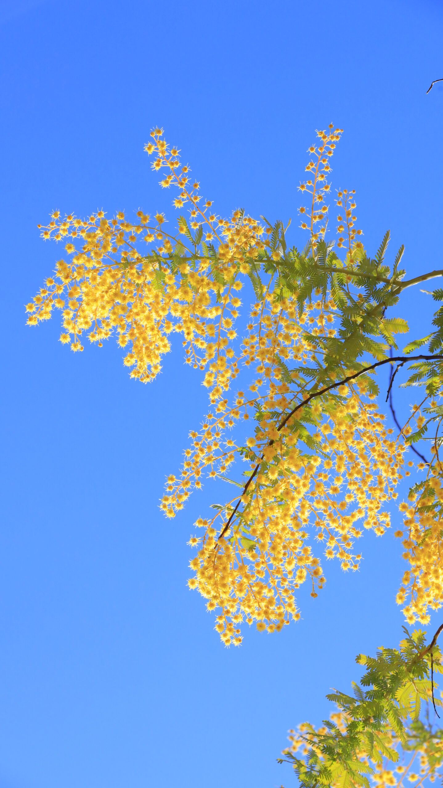 この写真は、木場公園で、ミモザの花と青空を下から見上げる構図で撮影したものです。明るく爽やかな一枚です。