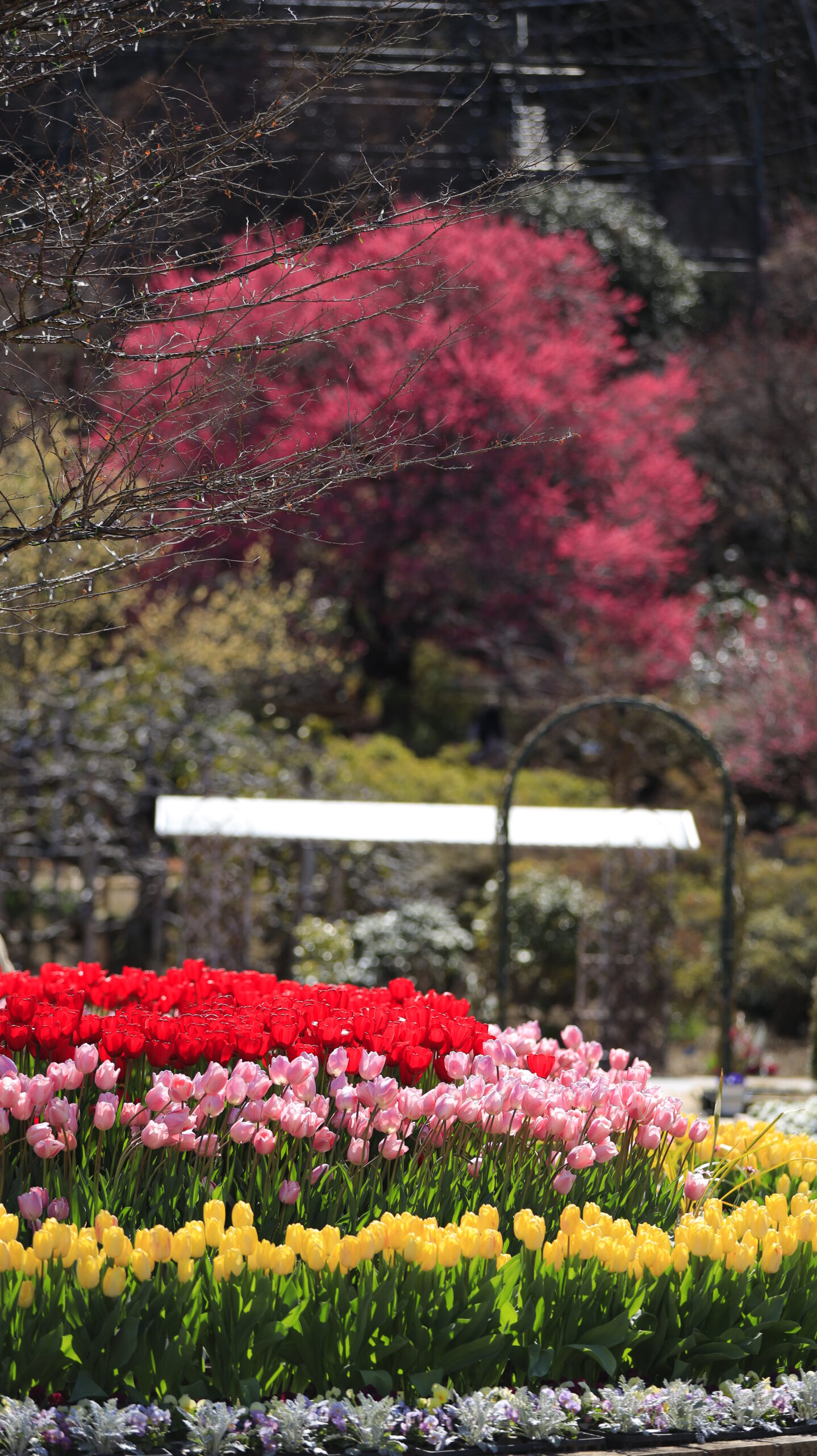 この写真は、あしかがフラワーパークで、遠くに見える梅の木を背景にしながら、花壇のカラフルなチューリップを撮影したものです。