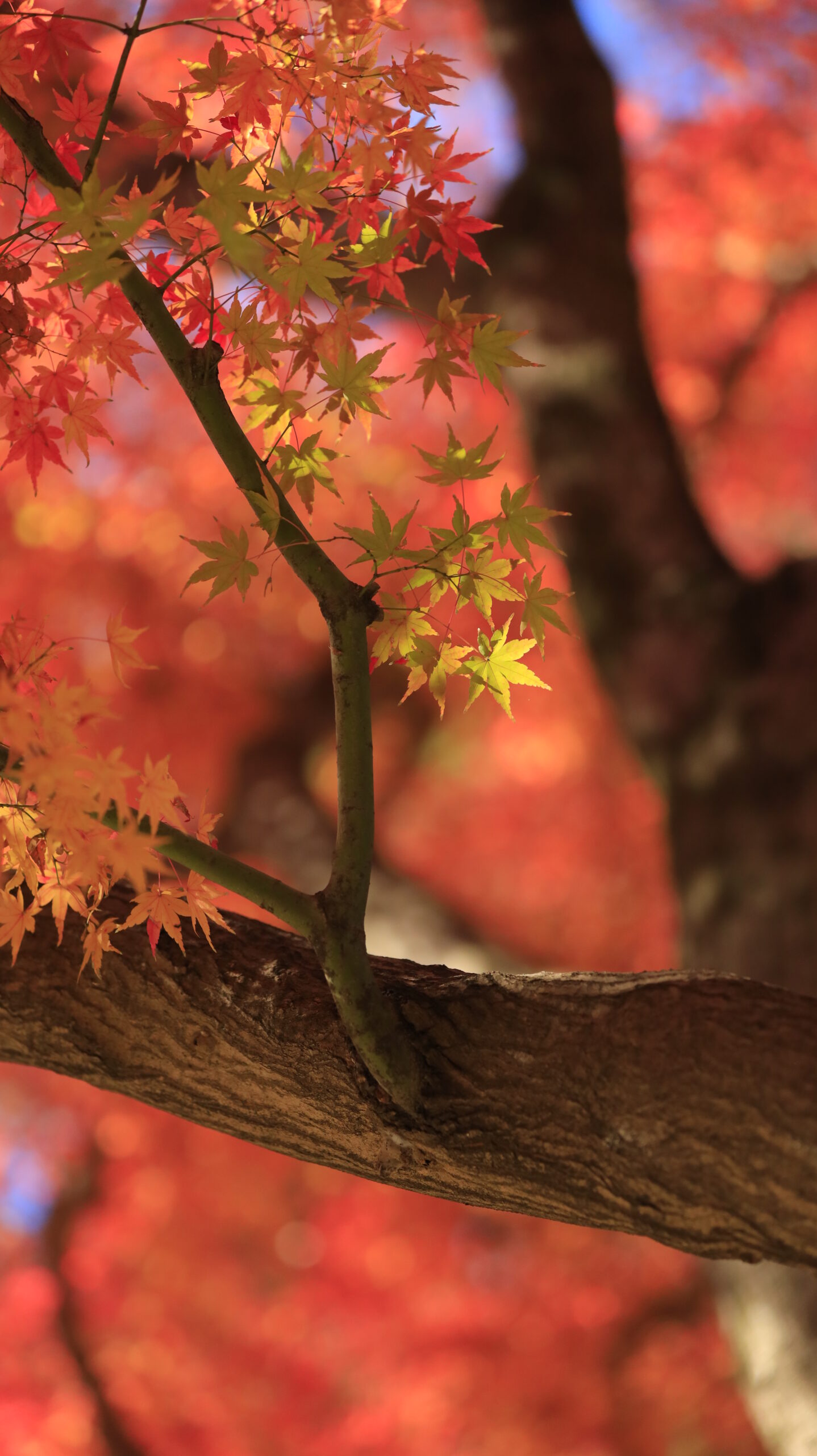この写真は、大田黒公園で、赤いモミジを背景に黄緑のモミジにピントを合わせて撮影したもので、二色の対比が鮮やかに映える一枚です。