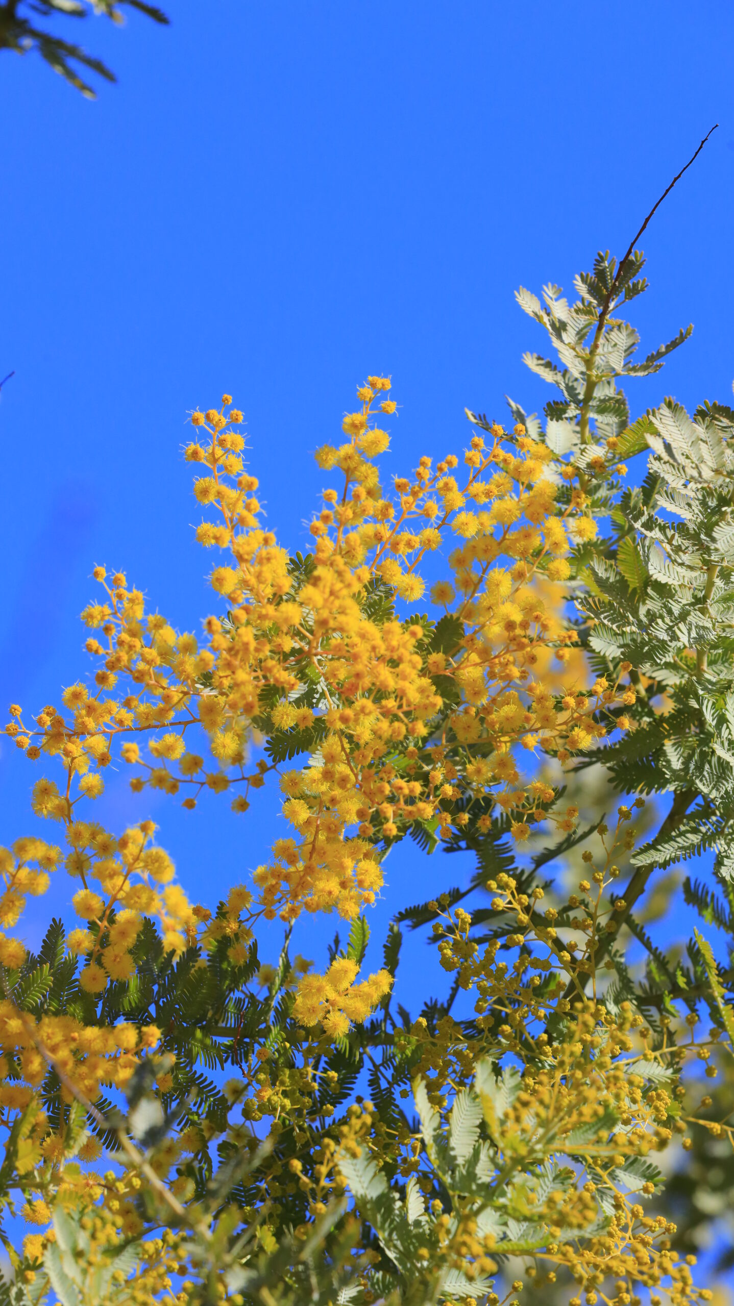 木場公園で青空の下に可愛らしいミモザが映える黄色と青のコントラスト