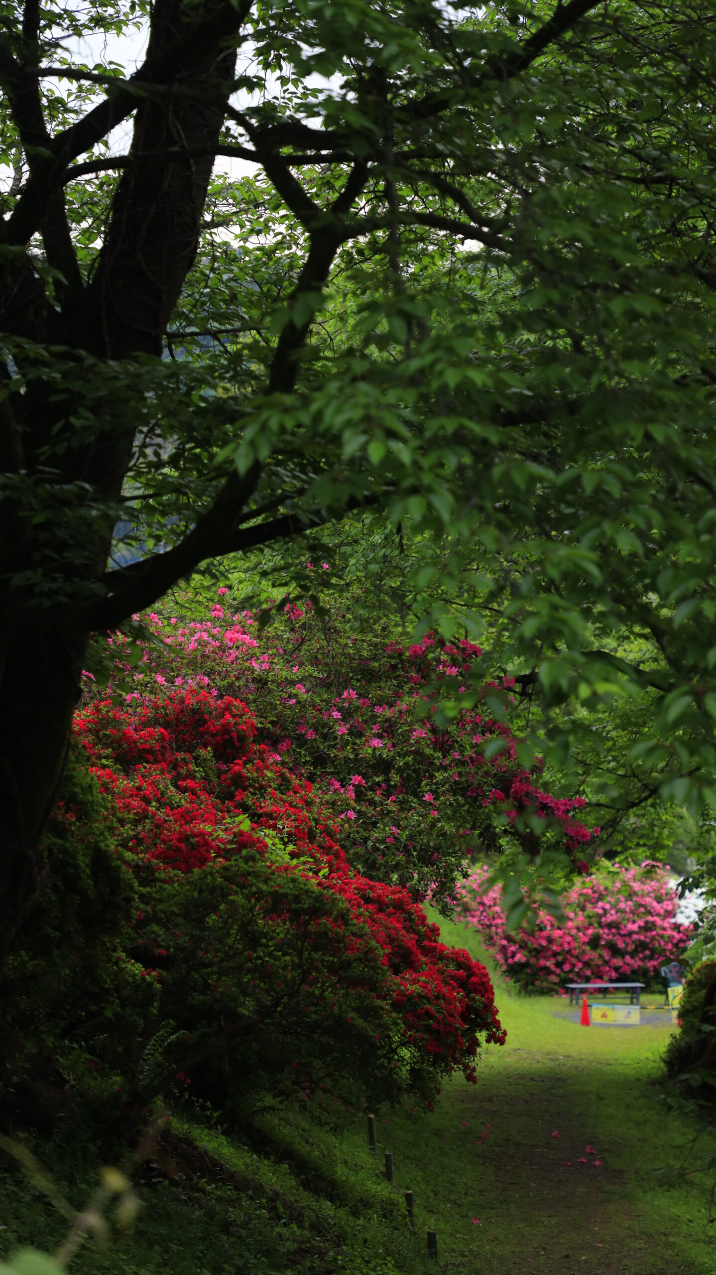 この写真は、五大尊つつじ公園で、大きな下の小路とツツジの様子を撮影したものです。小路を構図に取り入れることで、園内を歩きながらツツジを楽しむ臨場感が生まれ、散策したくなるような風景に仕上がっています。