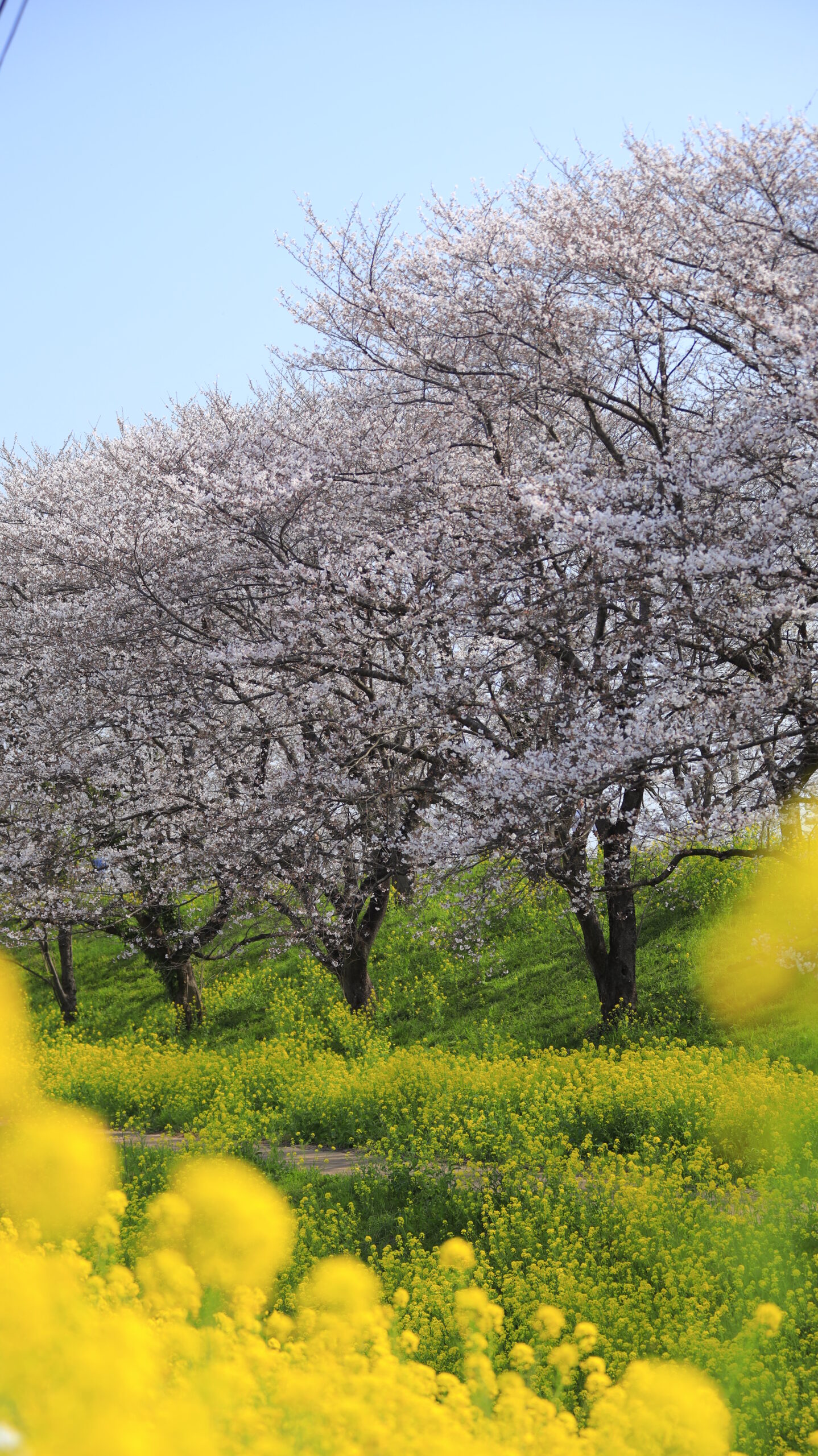 This photo was taken at Sakura Tsutsumi Park from the opposite bank of the river, blurring out the rape blossoms in the foreground and capturing the rows of cherry trees and rape blossoms in the background.