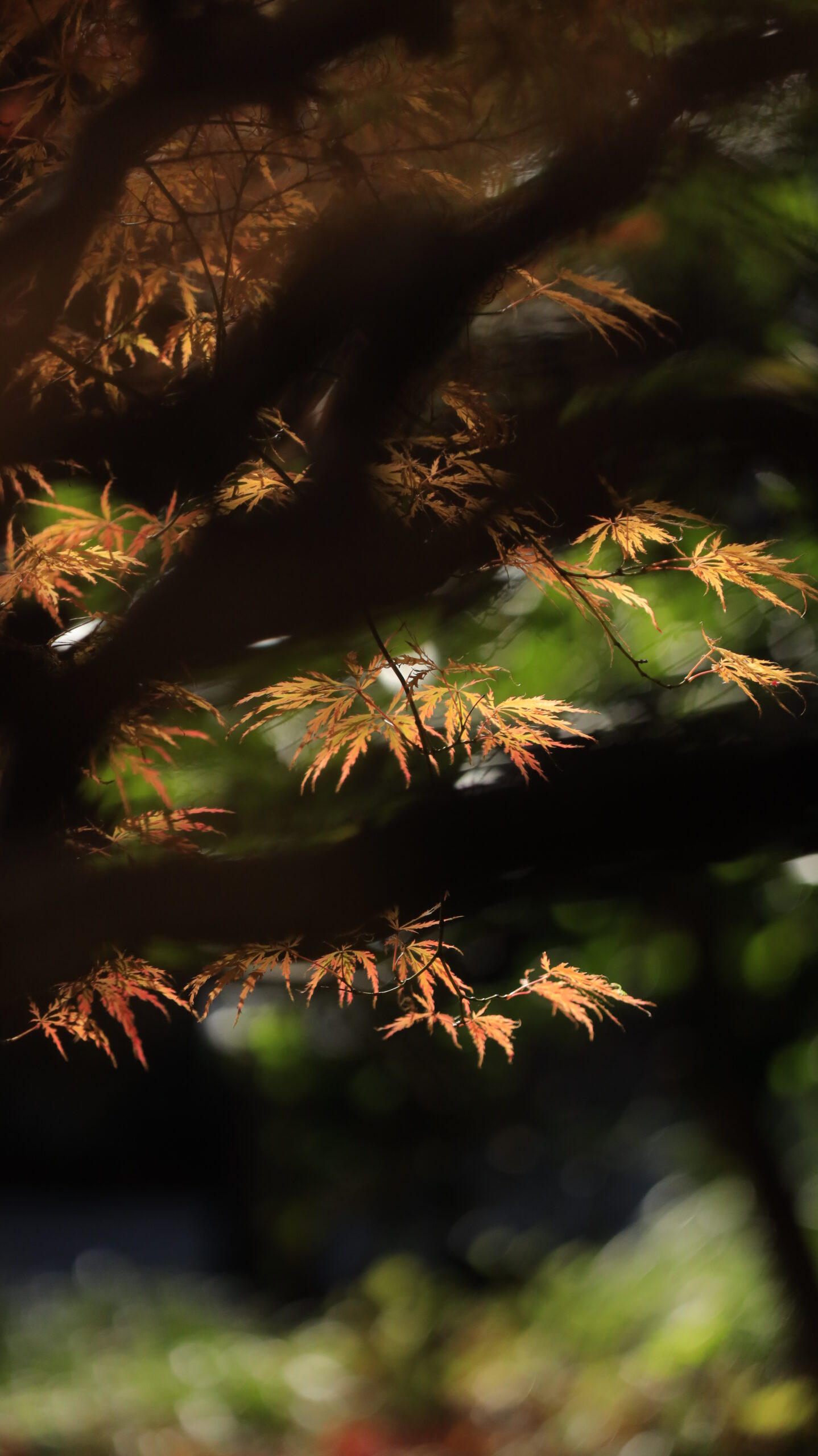 この写真は、荻外荘公園で、細いモミジの葉が枝の隙間からちらちらと見える様子を撮影したもので、静かな中に動きのある表情が感じられます。