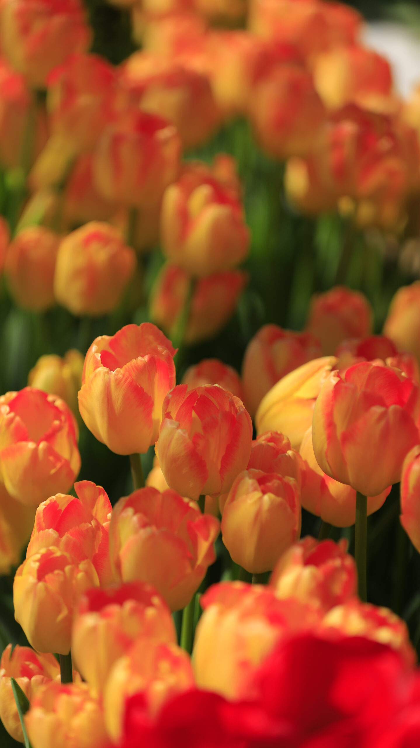 この写真は、あしかがフラワーパークで、鮮やかなオレンジ色のチューリップが広がる花壇を、花に当たる光を意識して撮影したものです。