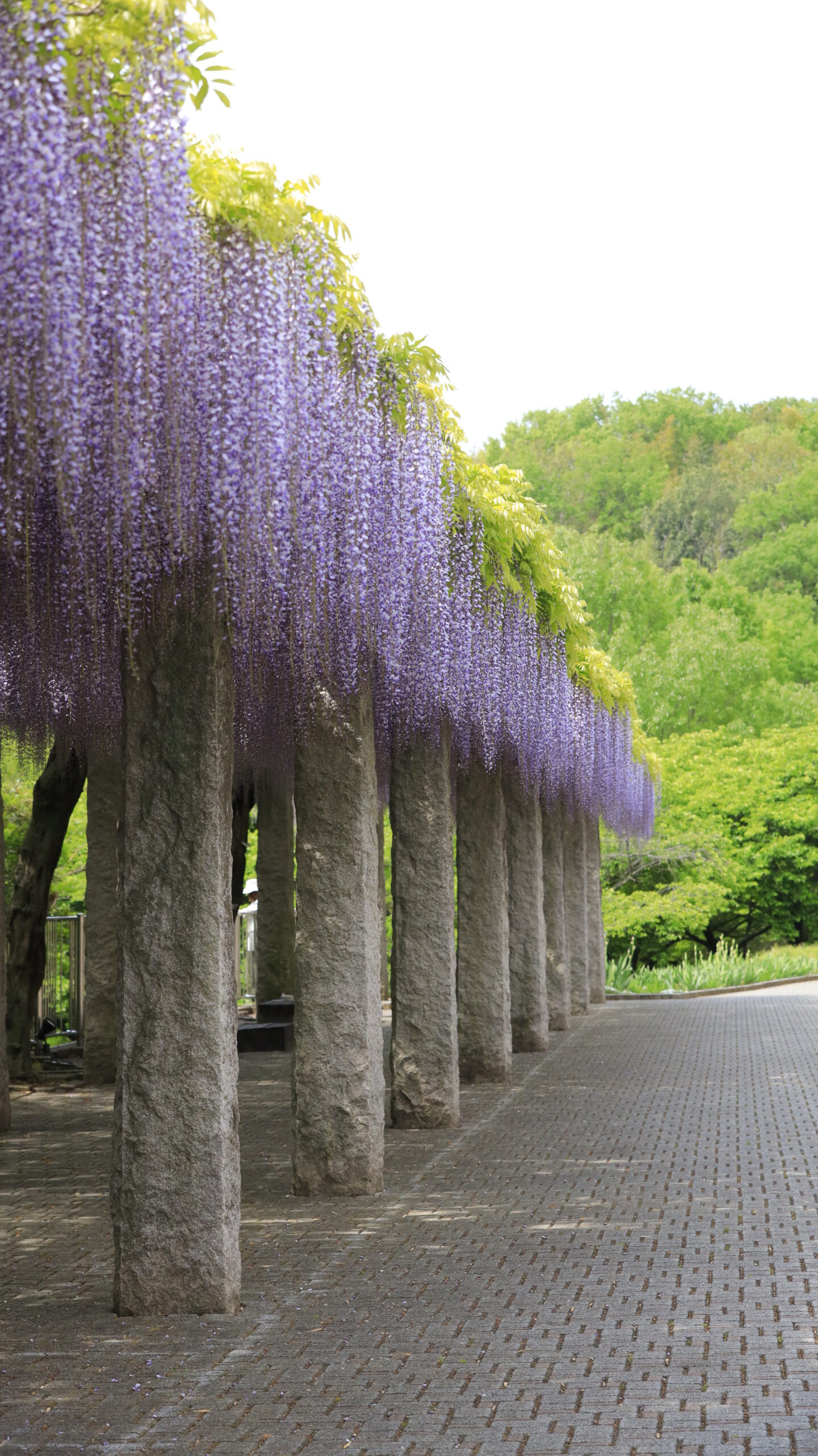 この写真は、ふじの咲く丘(藤岡)で、石柱が立派な通路の藤棚の様子を側面から撮影したものです。石柱の重厚感と藤の花の柔らかさを組み合わせることで、整った通路の奥行きと藤棚の美しさを表現しています。
