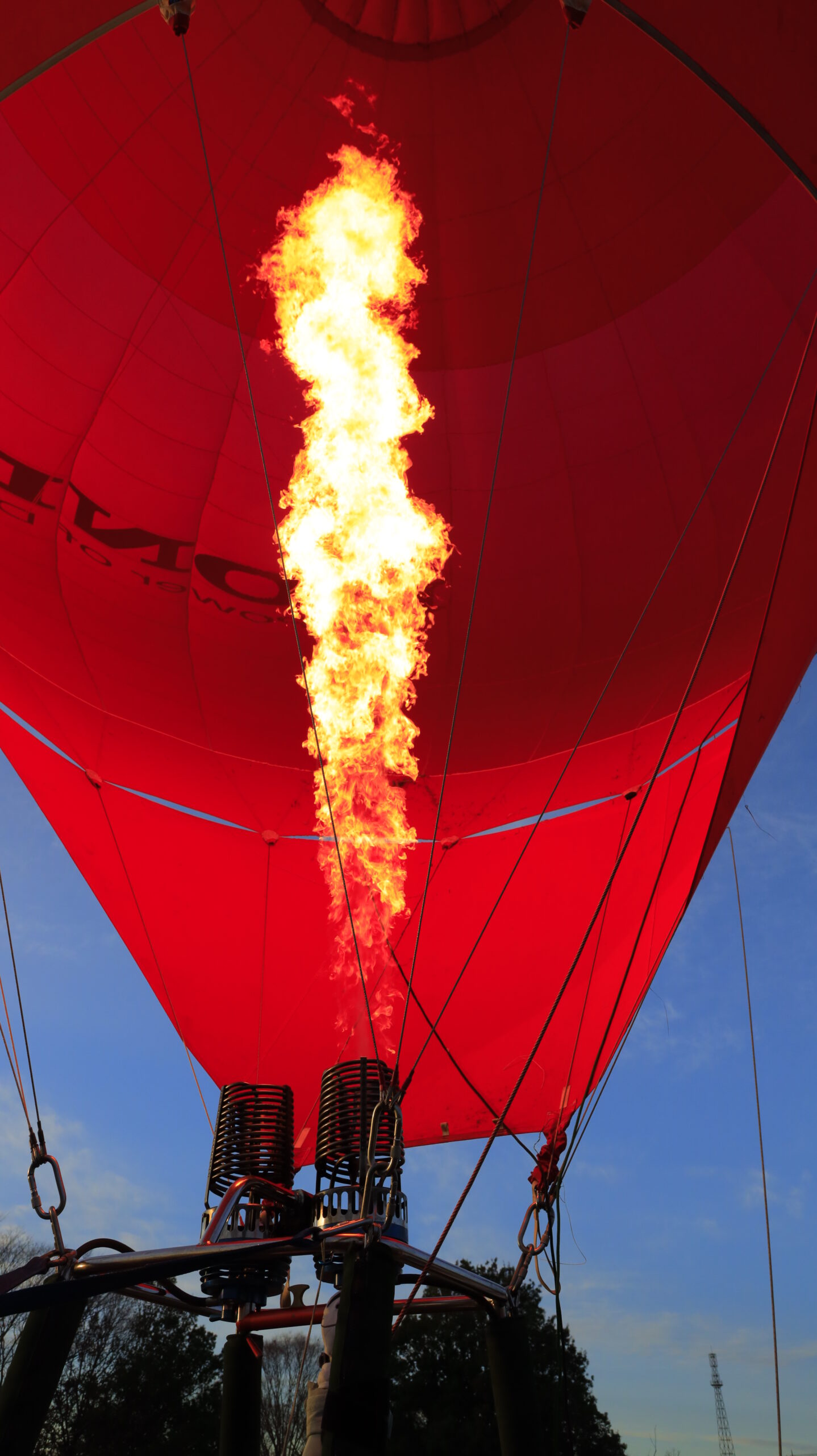 This photograph captures the moment when the burner of the red balloon is ignited at the Watarase Balloon Race, sending a powerful burst of flame skyward.