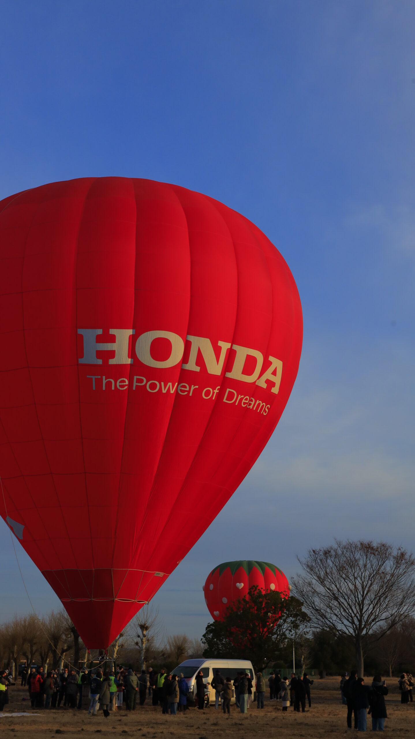 This photograph captures a scene from the Watarase Balloon Race, showing a red balloon alongside the people preparing and watching over it.