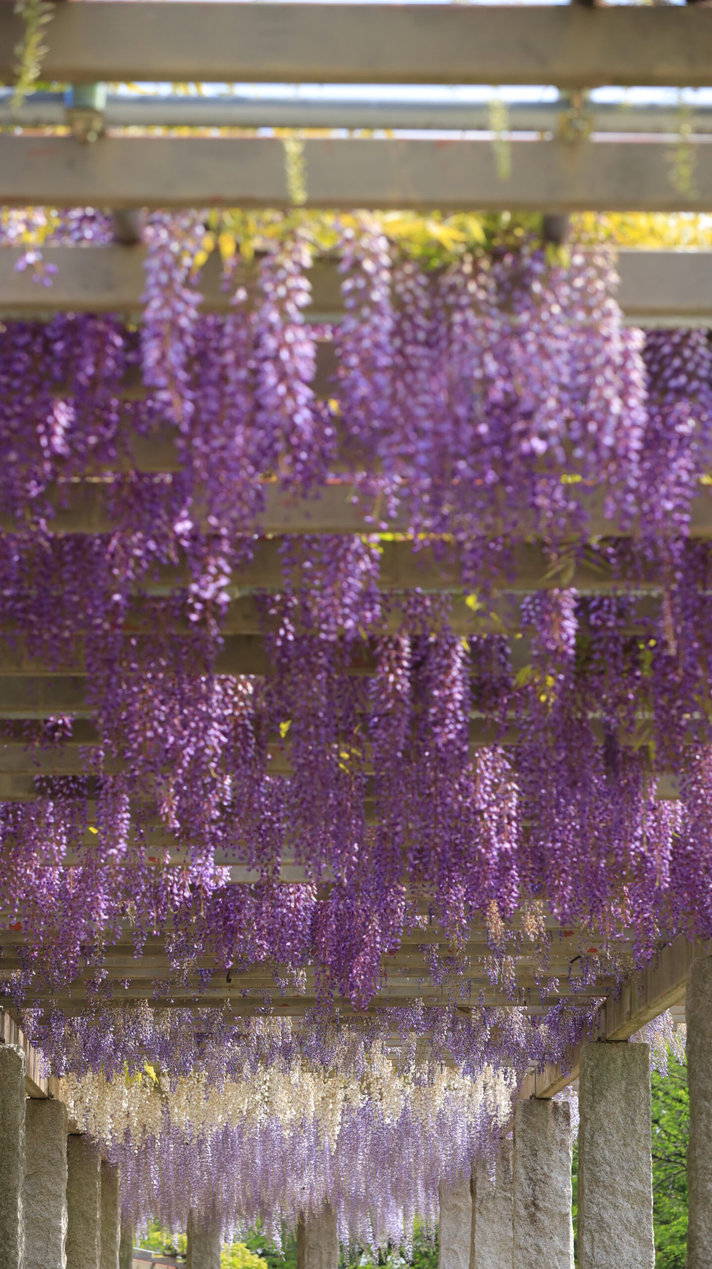 この写真は、ふじの咲く丘(藤岡)で、グラデーションがとても美しい藤の通路を撮影したものです。色合いの異なる藤が通路に沿って続く様子が印象的で、歩きながら花色の変化を楽しめる春の風景になっています。