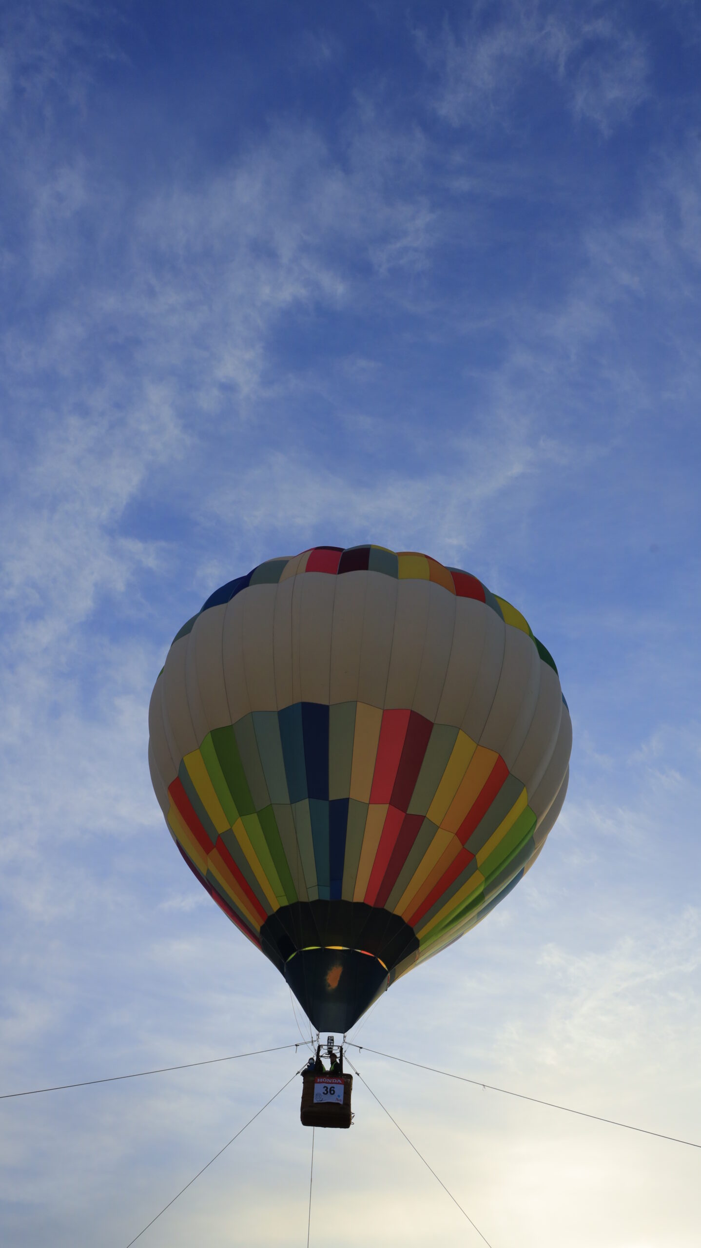 This photo captures the simple combination of colorful balloons and a clear blue sky at the Watarase Balloon Race.