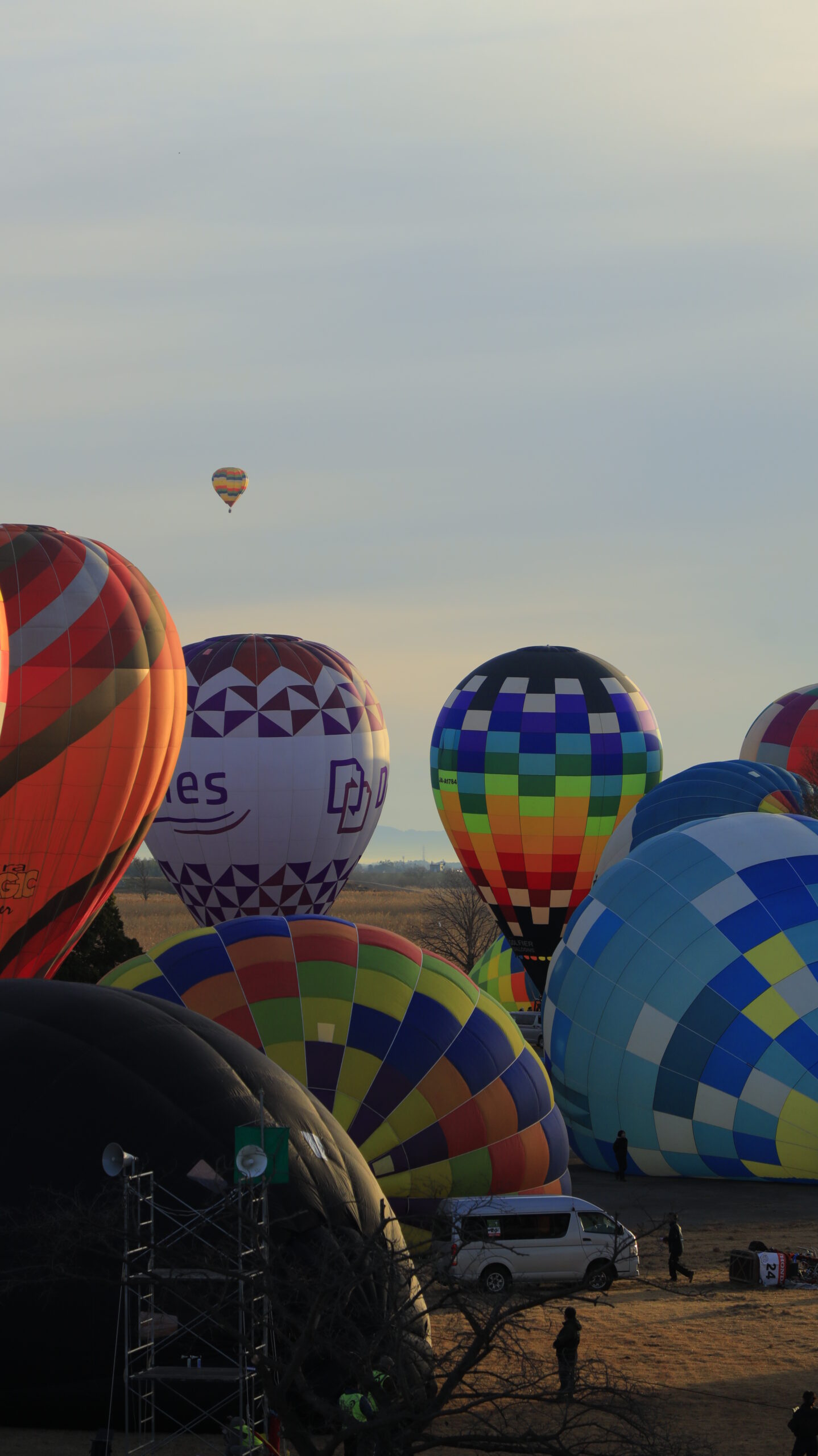 This photograph captures the bustling scene of preparations at the Watarase Balloon Race, where numerous balloons begin inflating one after another.