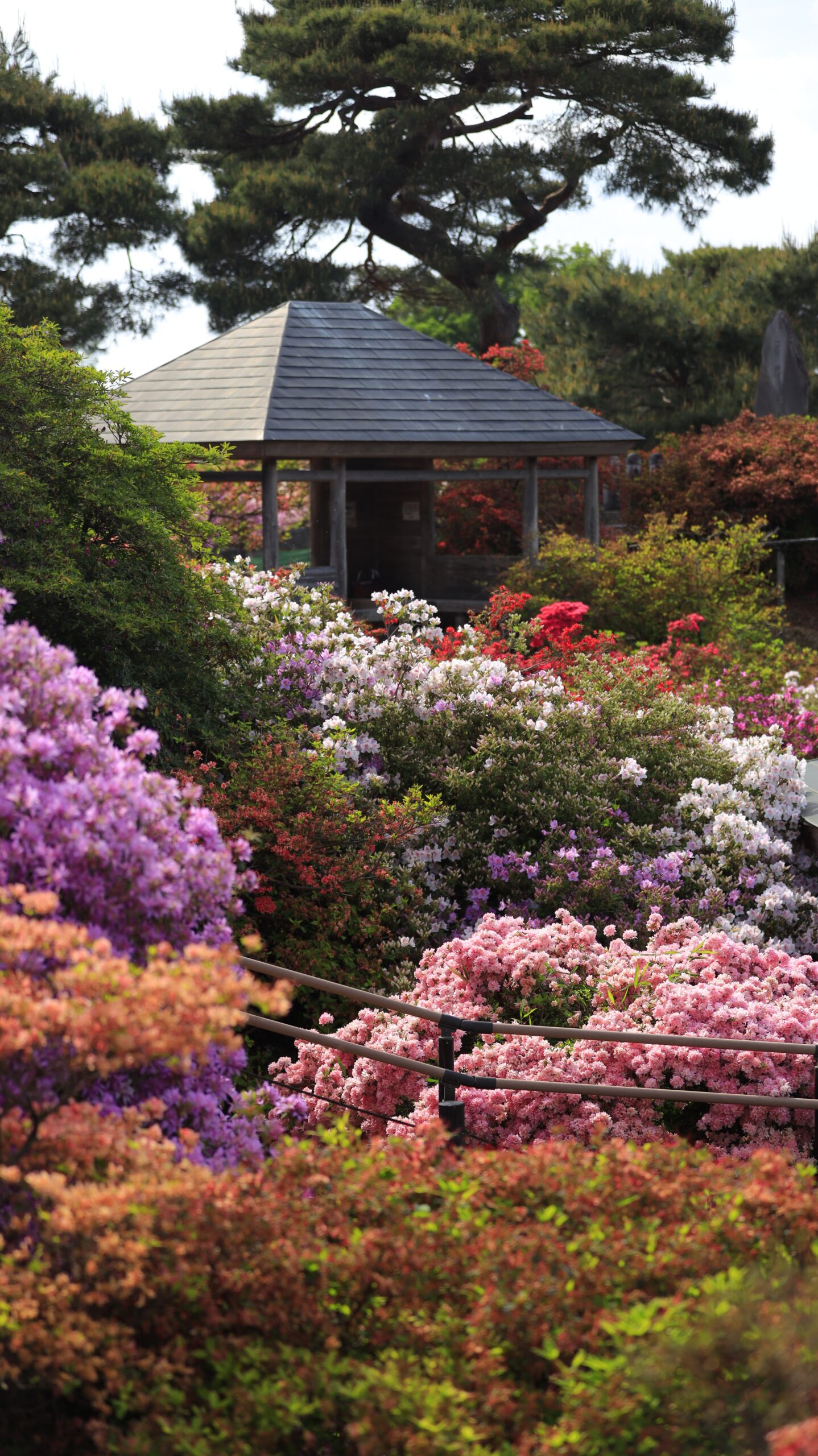 つつじが岡公園(舘林)でカラフルなつつじと休憩所を収めた春の風景