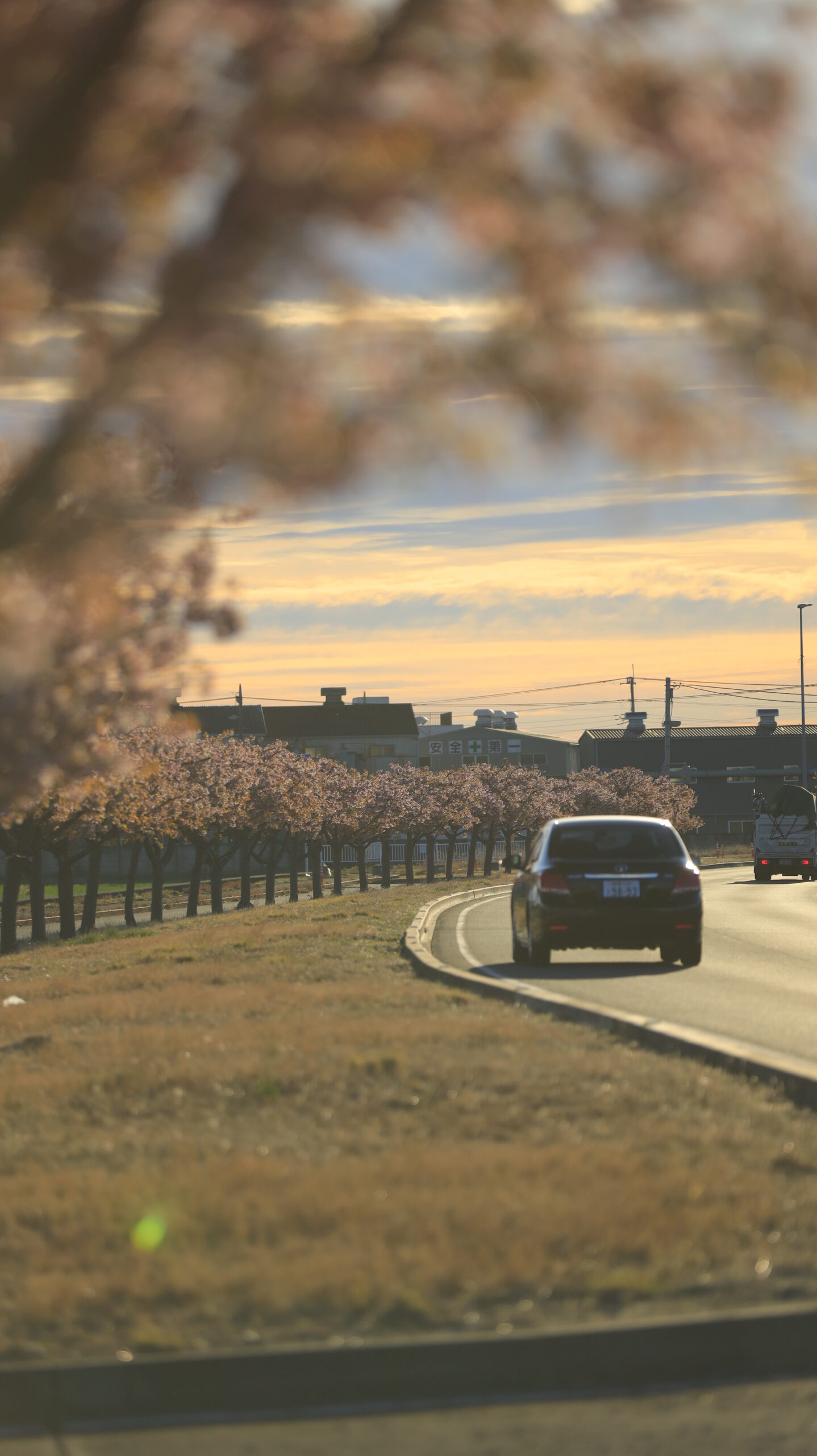 この写真は、玉村町の河津桜並木で、早朝の葉桜になりかけた桜並木と国道を走る車の様子を、低い位置から逆光で撮影したものです。