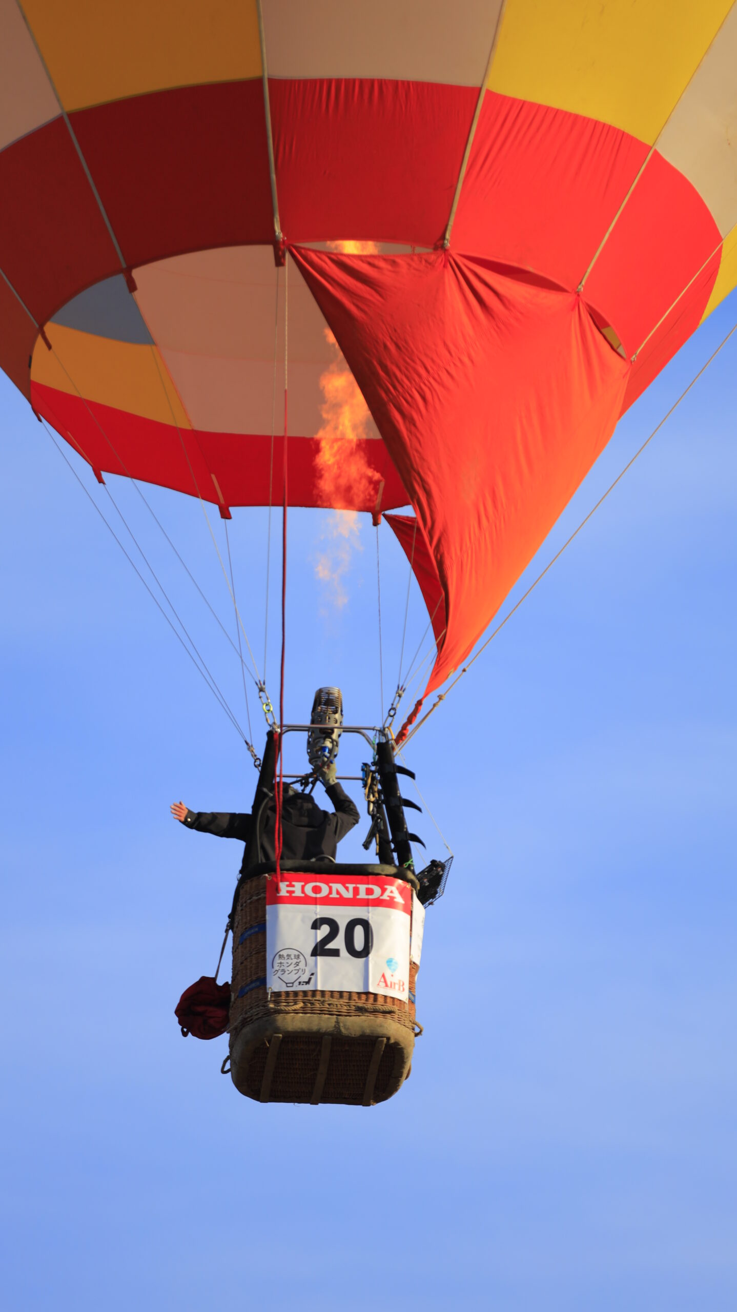 This photograph captures close-up shots of the colorful red and yellow basket sections and burners of hot air balloons at the Watarase Balloon Race.