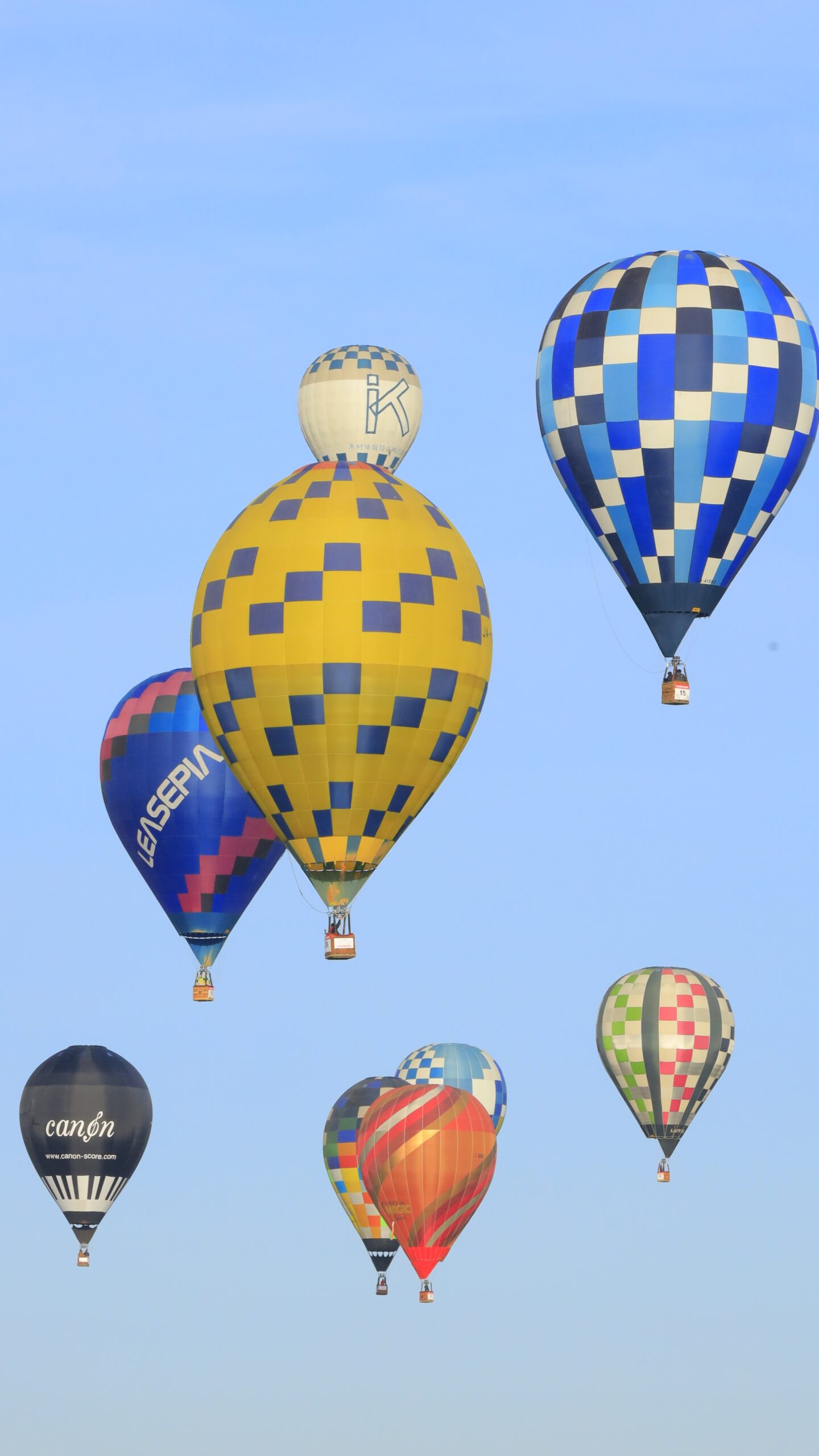 この写真は、渡良瀬バルーンレースで、たくさんのカラフルな気球が上空へ向かって浮かび上がっていく様子を撮影したものです。