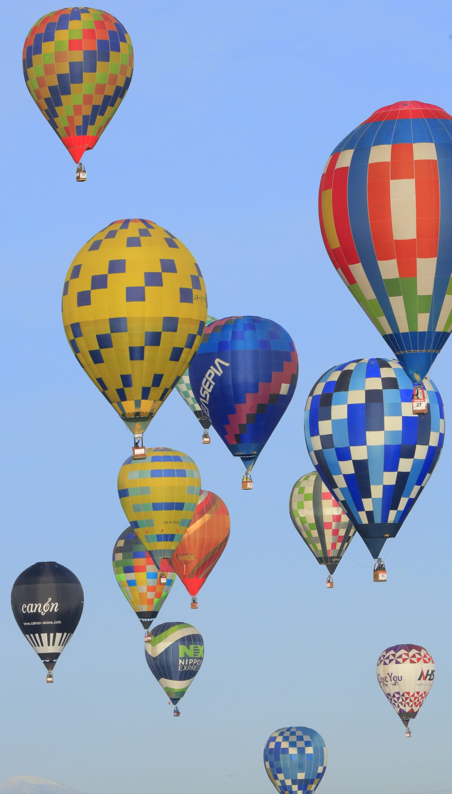 この写真は、渡良瀬バルーンレースで、非常に多くの気球が一斉に空へ上がっていく迫力ある光景を撮影したものです。