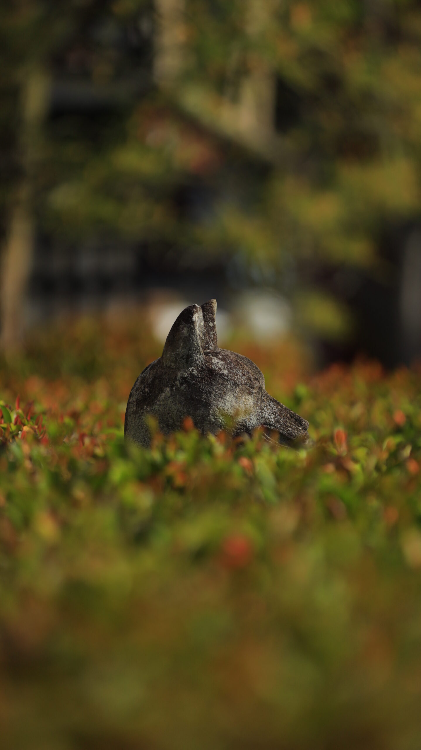 この写真は、笠間稲荷神社で、垣根の間にある狐の像が横を向く様子を撮影したものです。さりげない視点で狐の像を切り取ることで、神社散策中に見つけた小さな発見のような雰囲気を演出しています。