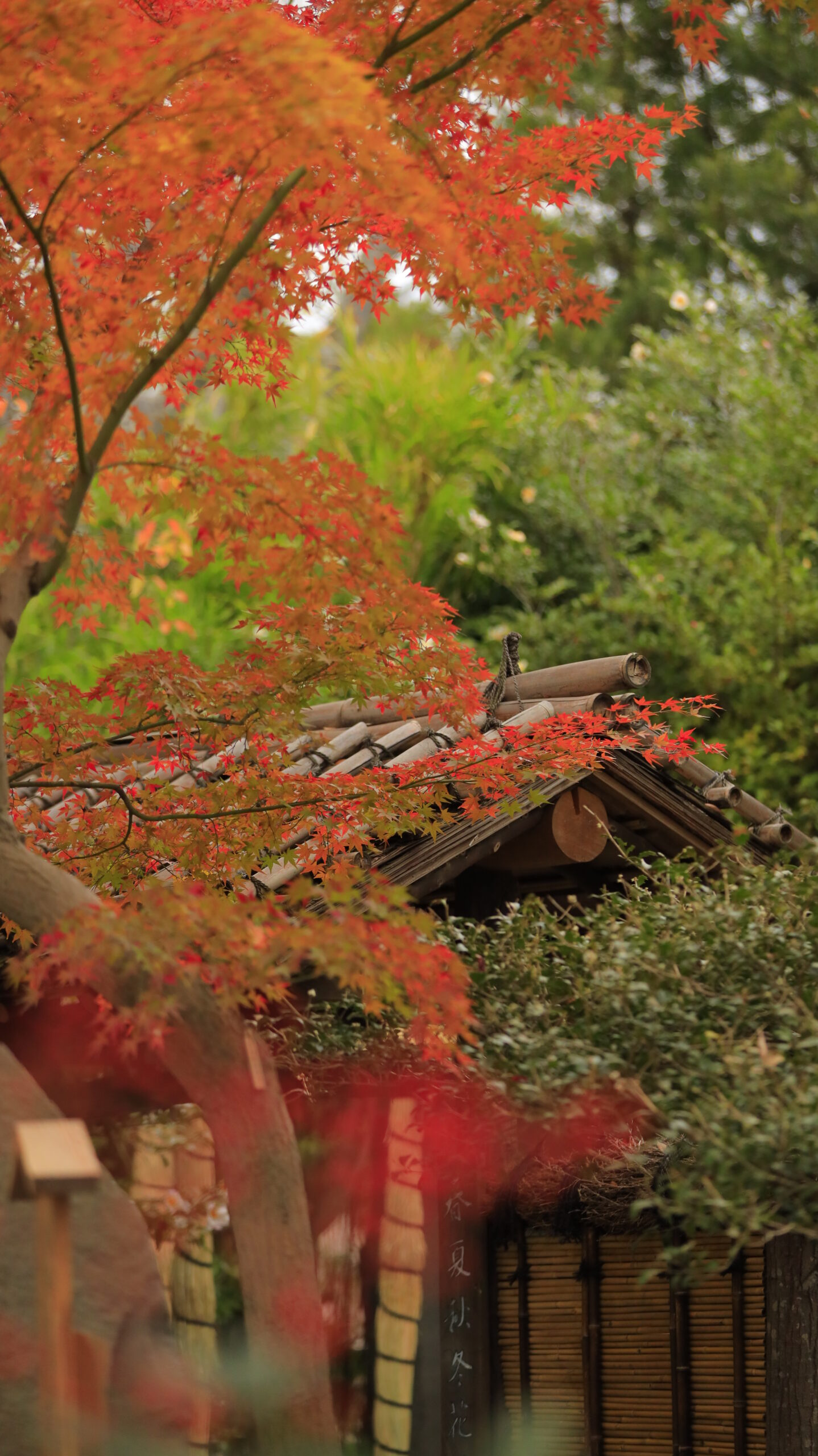 This photograph captures the autumn foliage of the maple trees spreading near the entrance at Mukojima Hyakkaen Garden.