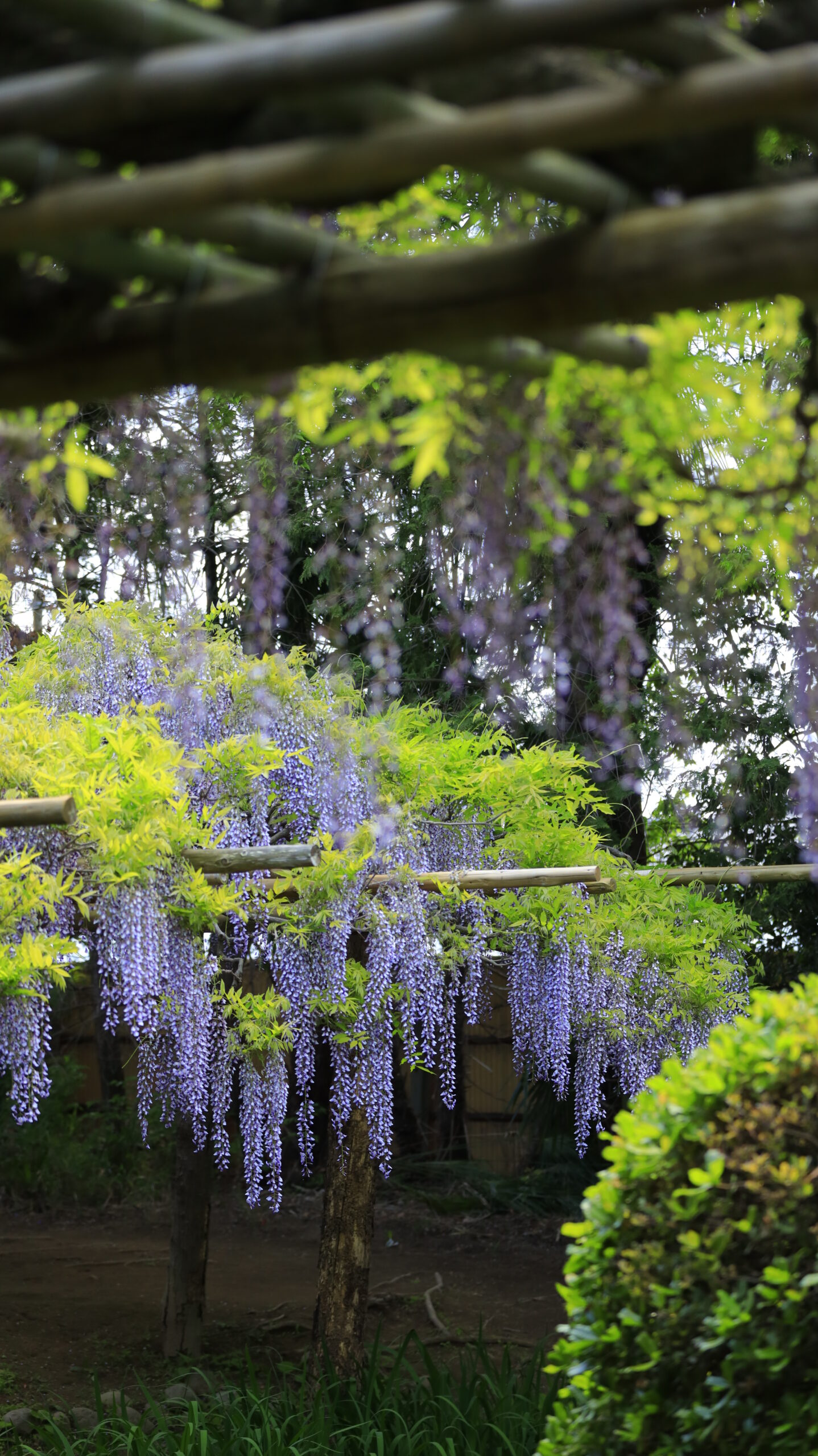 Wisteria flower garden (Wisteria at Ushijima)|Wisteria trellis viewed from the wisteria trellis