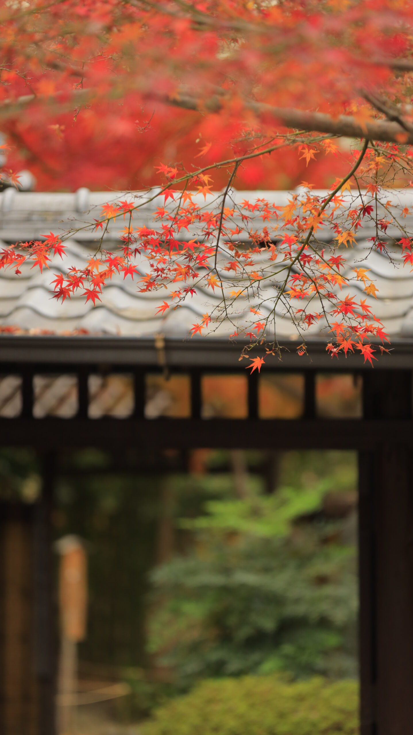 This photograph captures the vibrant autumn foliage of maple trees spreading over the entrance gate at Mukojima Hyakkaen Garden.