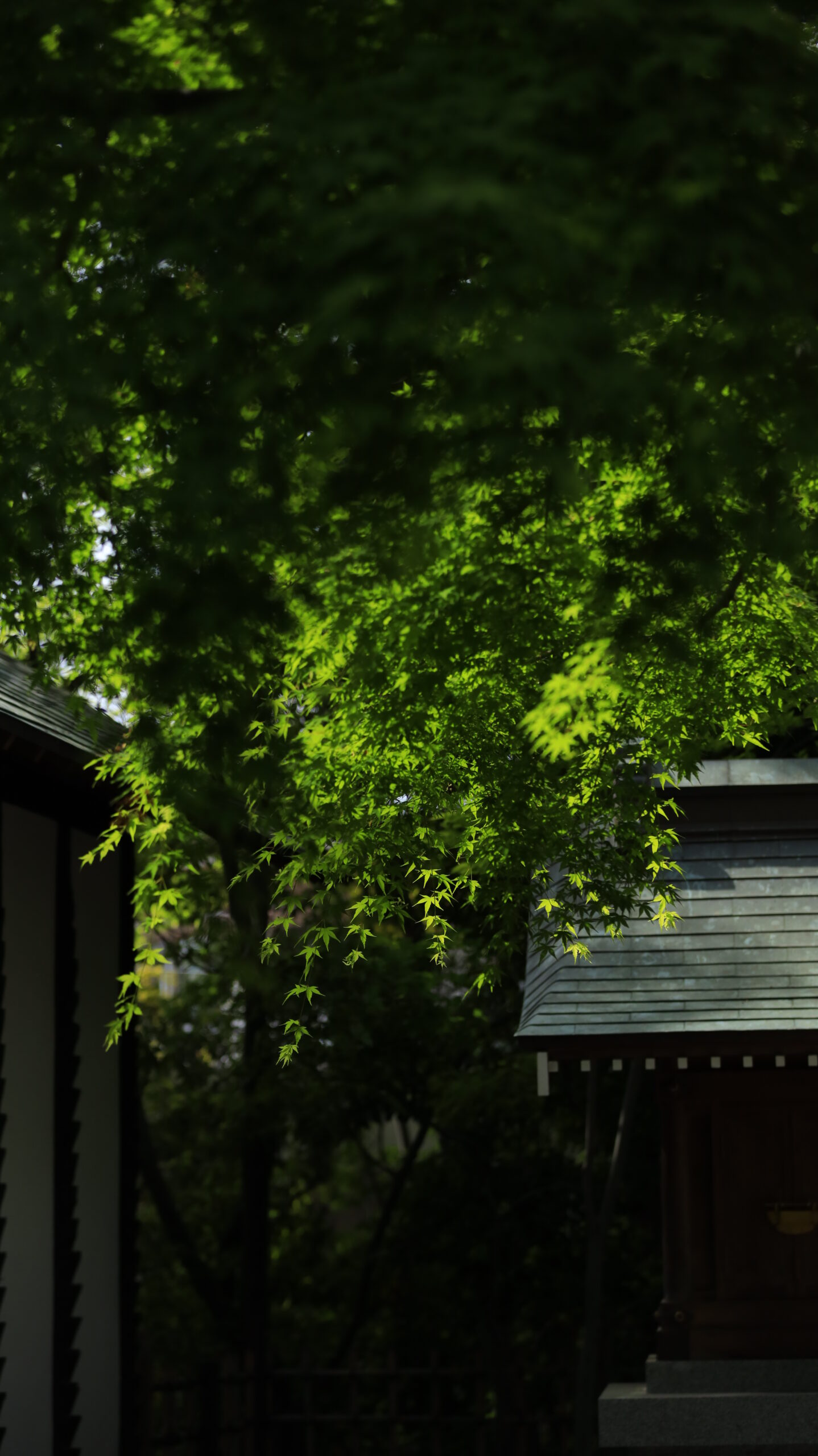 この写真は、久伊豆神社(越谷)で、薄暗い場所で青もみじと建物を撮影したものです。落ち着いた光の中に新緑が浮かび上がり、神社境内ならではの静けさと和の雰囲気を感じられる写真です。