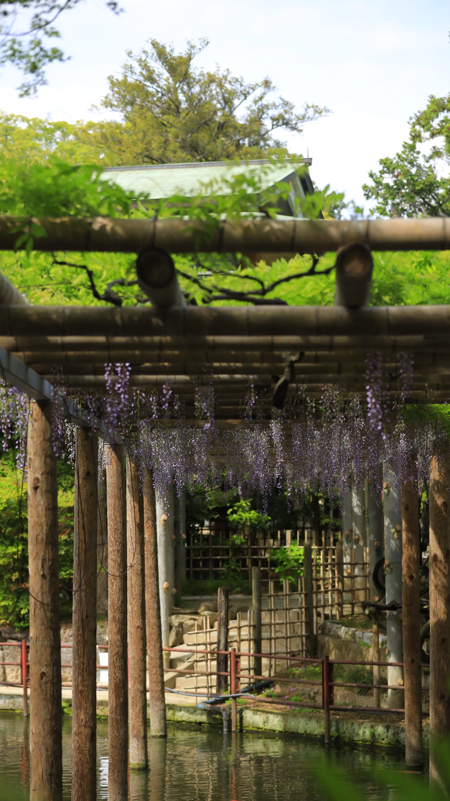 この写真は、久伊豆神社(越谷)で、池に差し掛かる藤棚を横側から撮影したものです。水辺に伸びる藤棚の様子を横から捉えることで、池と藤がつくる穏やかな景観と奥行きを表現しています。