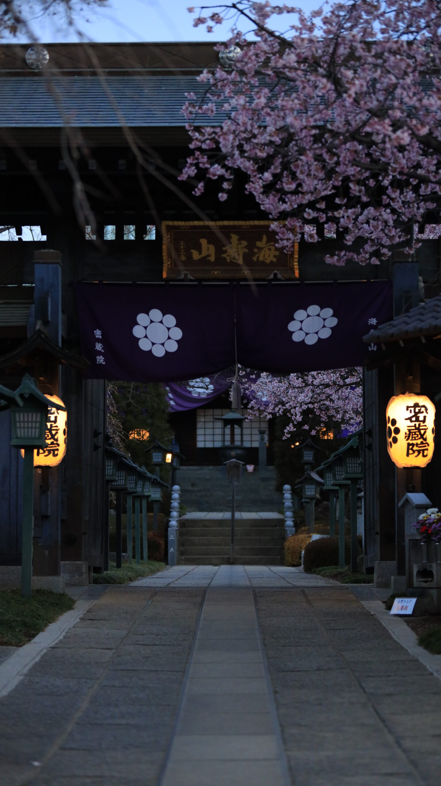 この写真は、密蔵院で、わずかに明るくなり始めた夜明け直前のタイミングに、表側から門と提灯、そして安行桜を低い位置から見上げる構図で撮影したものです。