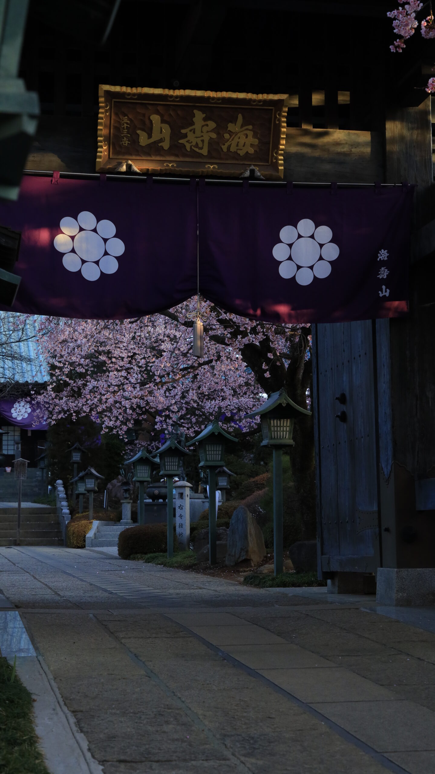 この写真は、密蔵院で、表門を左側から見上げる構図で、奥に咲く桜や差し込むわずかな太陽の光を意識して撮影したものです。