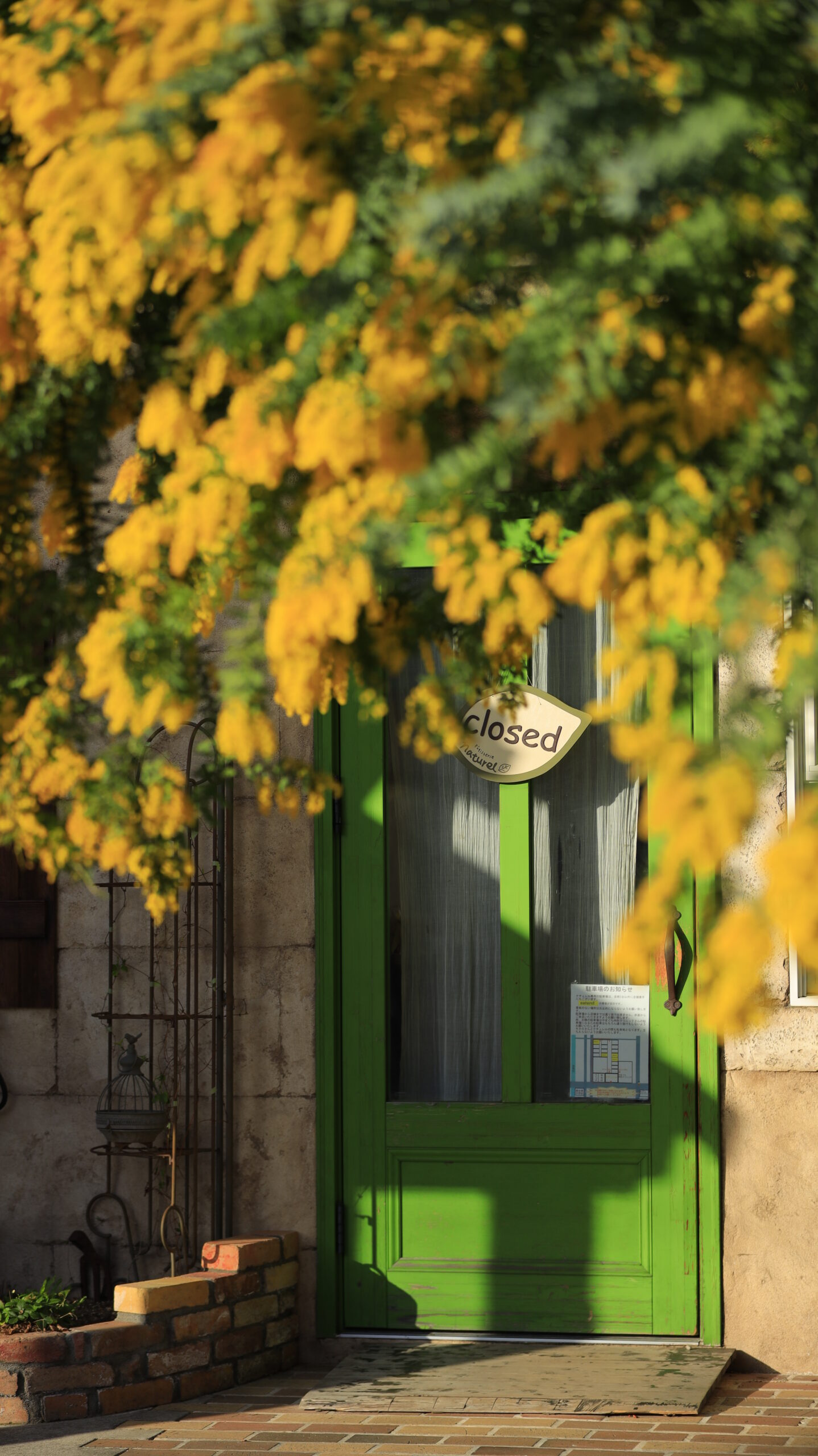 この写真は、パティスリーナチュレルで、まだ開店前の静かな時間帯に、お店のドアとミモザの花を組み合わせて撮影したものです。パティスリーナチュレルは人気のケーキ店のため、撮影の際はお店の営業や来店されるお客様の迷惑にならないよう、マナーを守って楽しむようにしましょう。