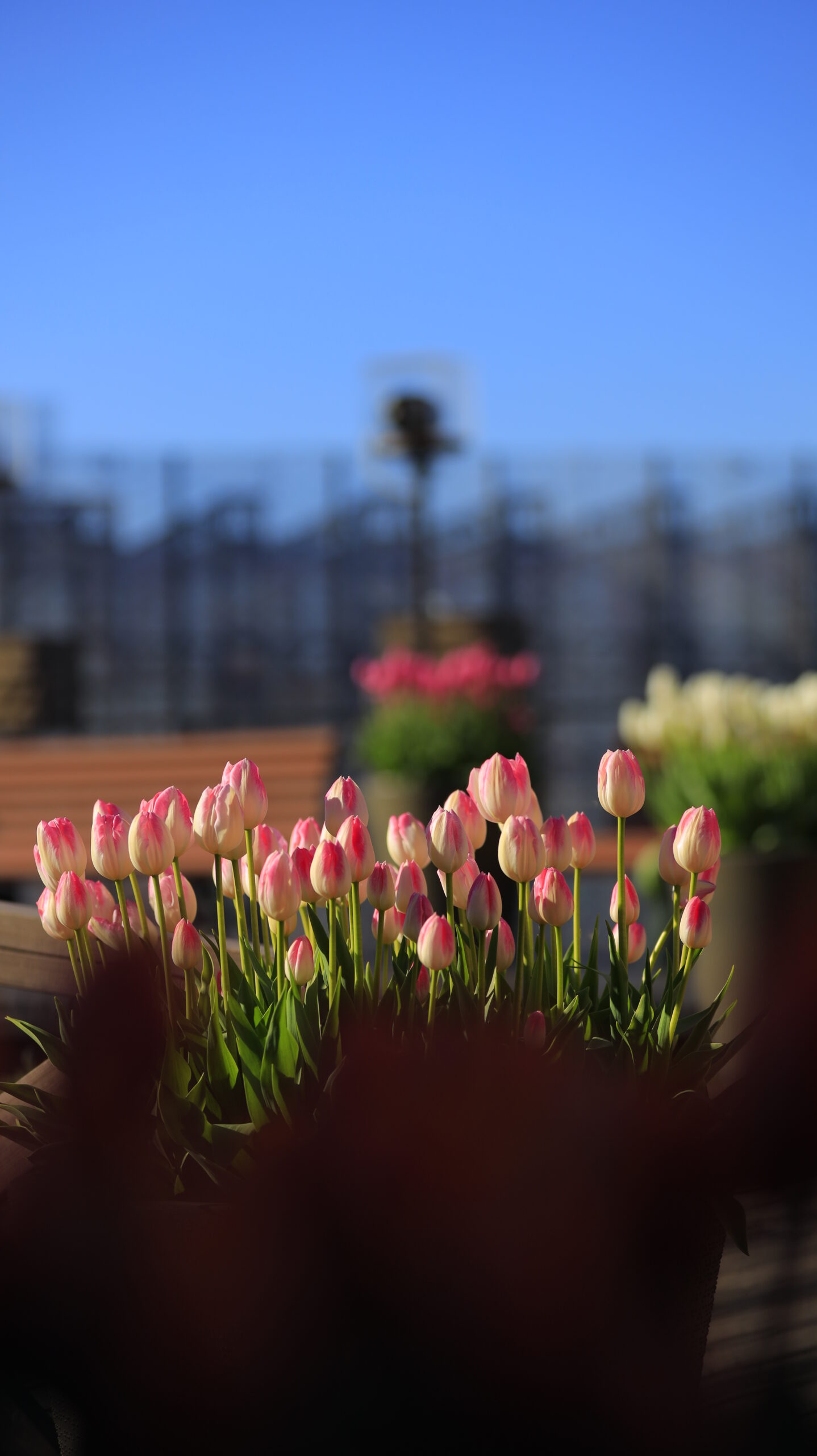 This photo was taken at Tokyo German Village of light pink ice tulips blooming beautifully in a flower bed. It is intended to convey the gentle hues typical of winter flower beds.