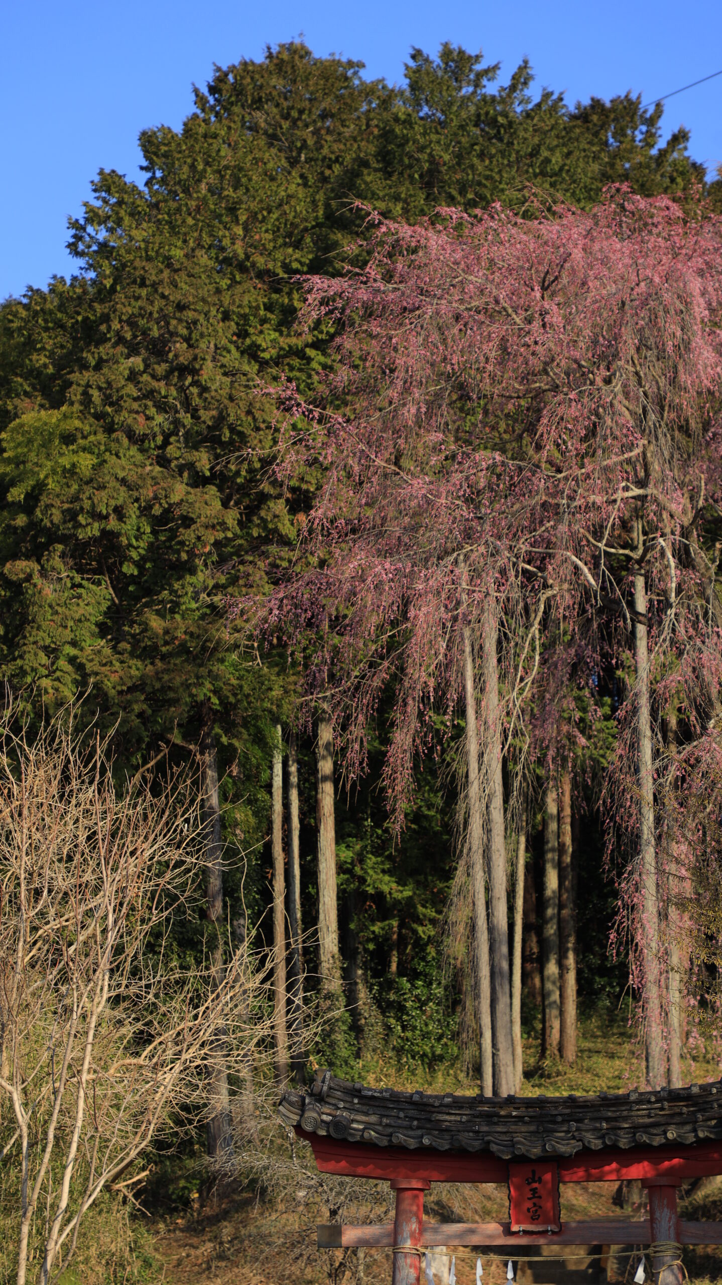 This photo was taken at Hie Shrine, combining the weeping cherry tree at the beginning of blooming with the torii gate.