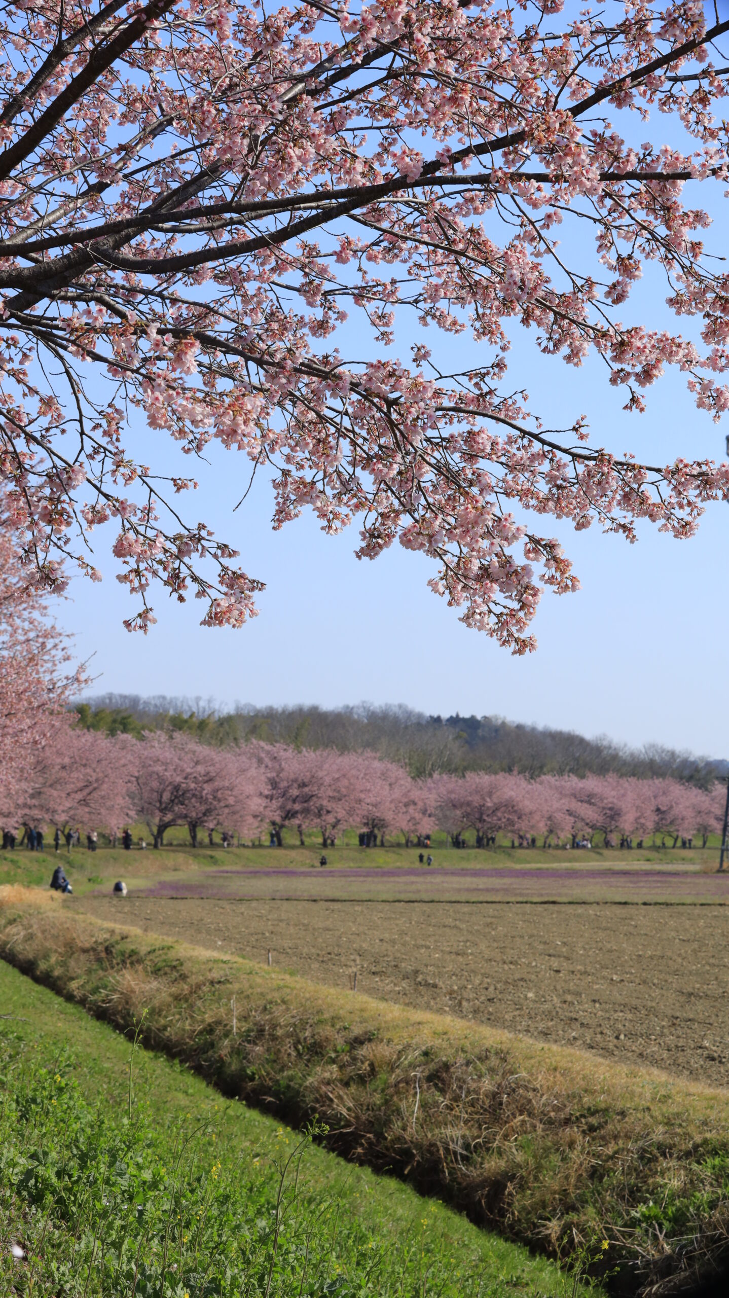 At Kita Asaba Sakura Tsutsumi Park, the cherry blossoms in the foreground are in focus and the row of trees at the back of the composition gives a sense of expanse.
