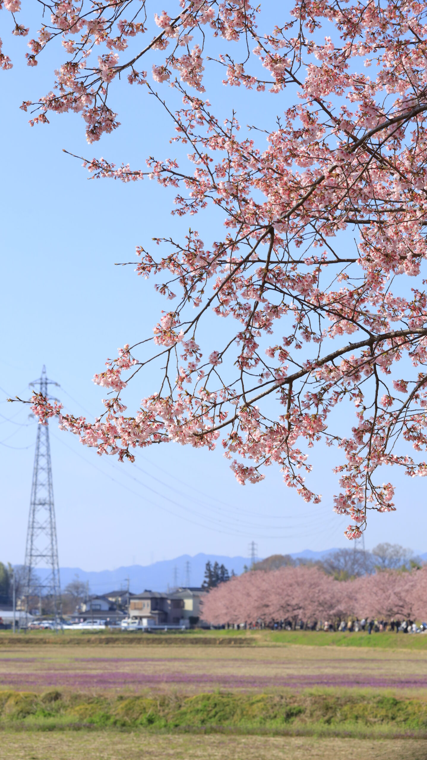 This photo was taken at Kita Asaba Cherry Blossom Bank Park, with the cherry tree in the foreground in focus and depth in the forward light.