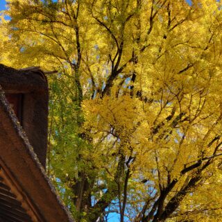 真上に広がる黄金色の天井は、逆光で撮ると透けた葉が輝き、幻想的に。