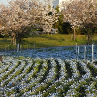 広々とした園内に咲くネモフィラが開放的。やわらかな青のグラデーションが心地よい春景色です。