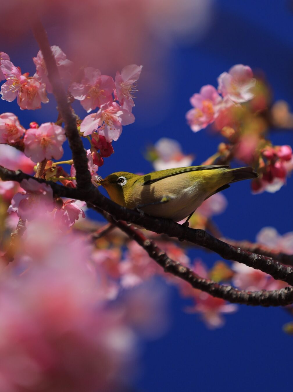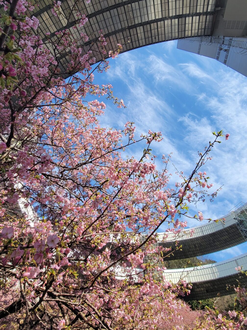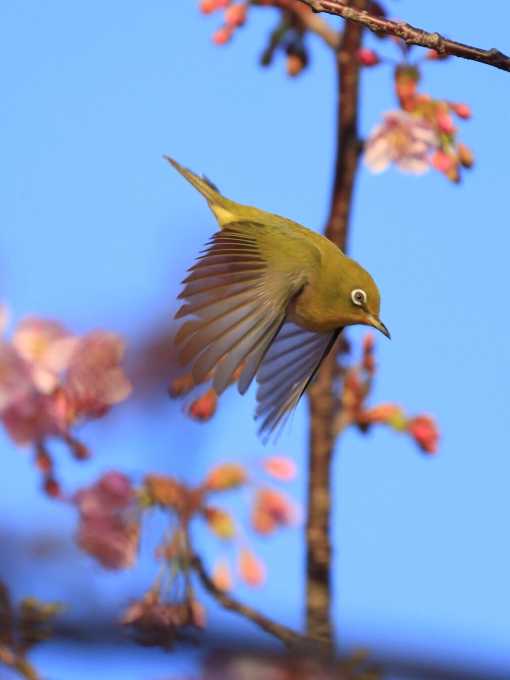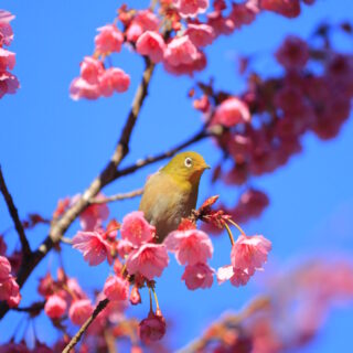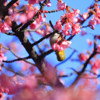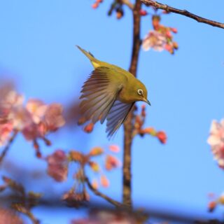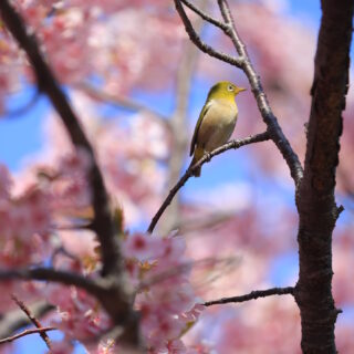 そこから下り、横須賀美術館へ向かいます。到着してみると――改装中。あれれれ。紫陽花の季節に感動した場所なので少し残念。ただ庭の河津桜は綺麗に咲いていて、しかもメジロ祭り再び。あんなポーズ、こんなポーズ。被写体サービス精神旺盛です。連写が止まりません。