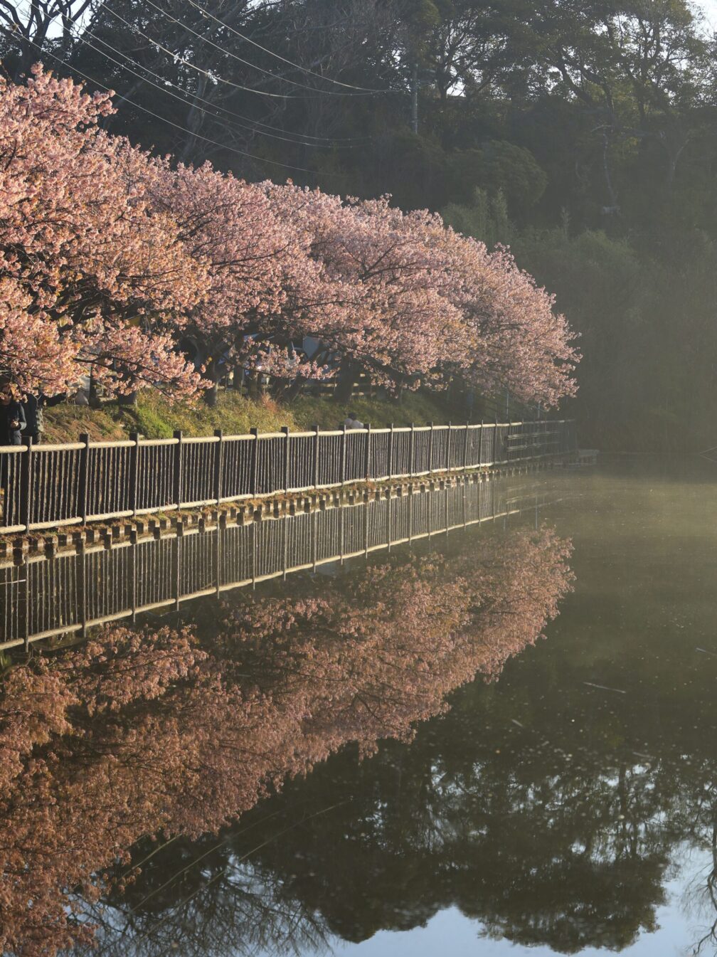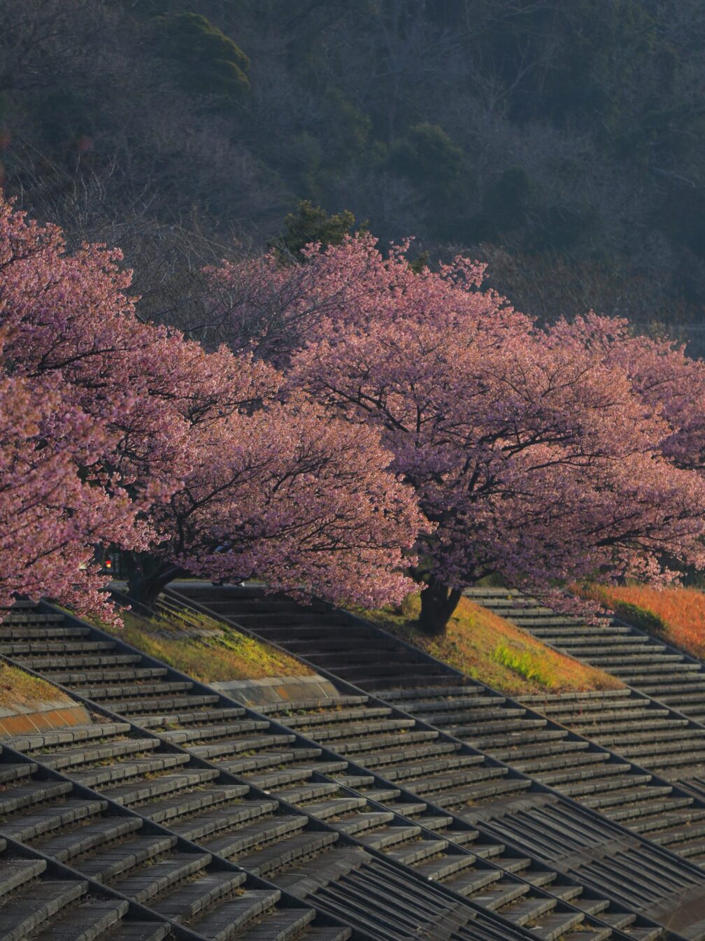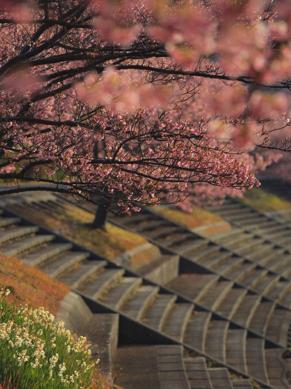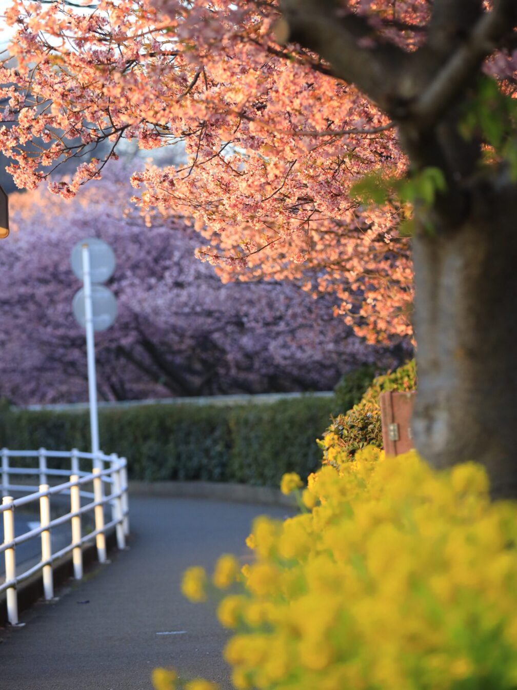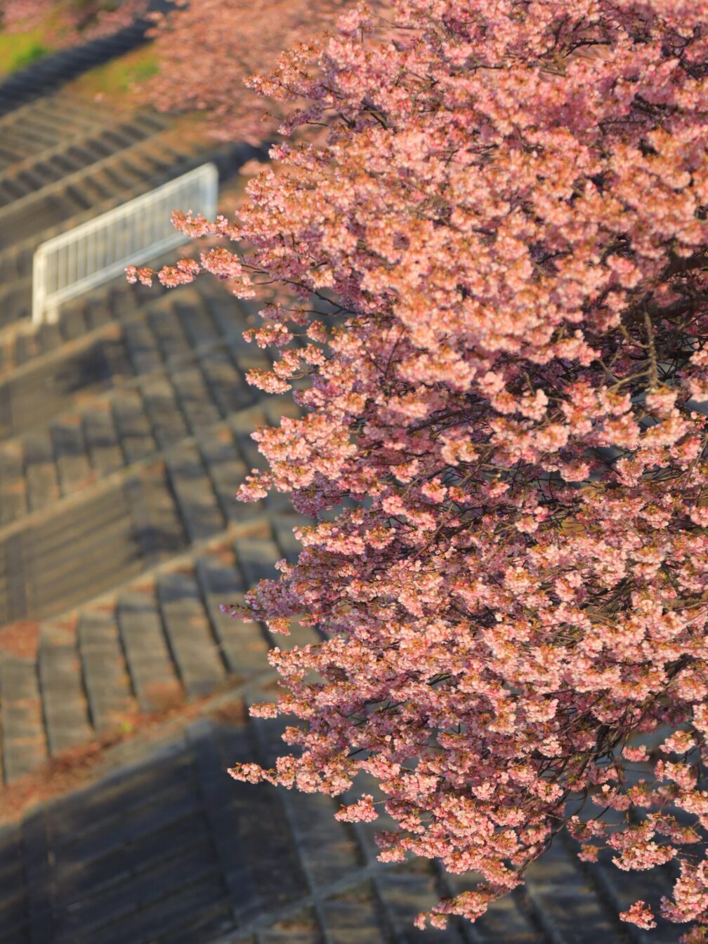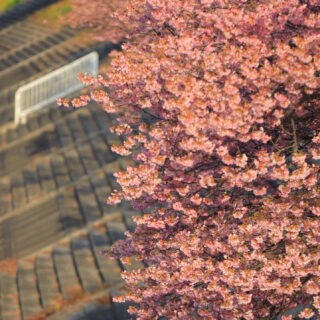 川沿いに咲く満開の河津桜。両岸をピンクに染めるその景色は、想像以上でした。温泉の湯けむりが立ちのぼり、のどかな空気が流れる。ああ、来てよかった。階段で撮った逆光の一枚は、この日のベストショット。光と影の追いかけっこ、最高です。