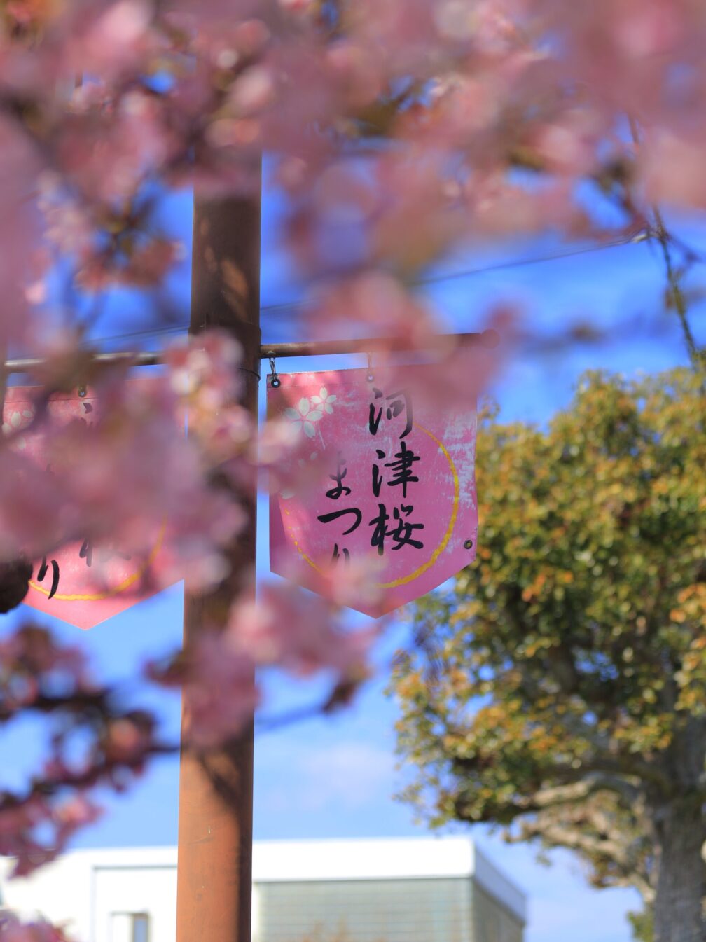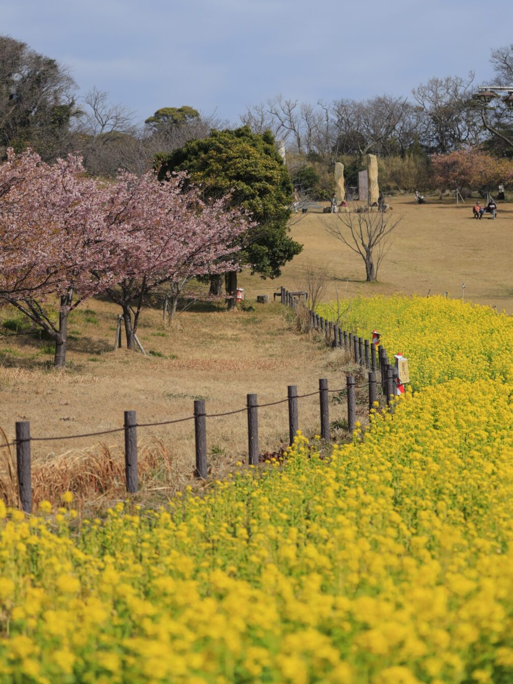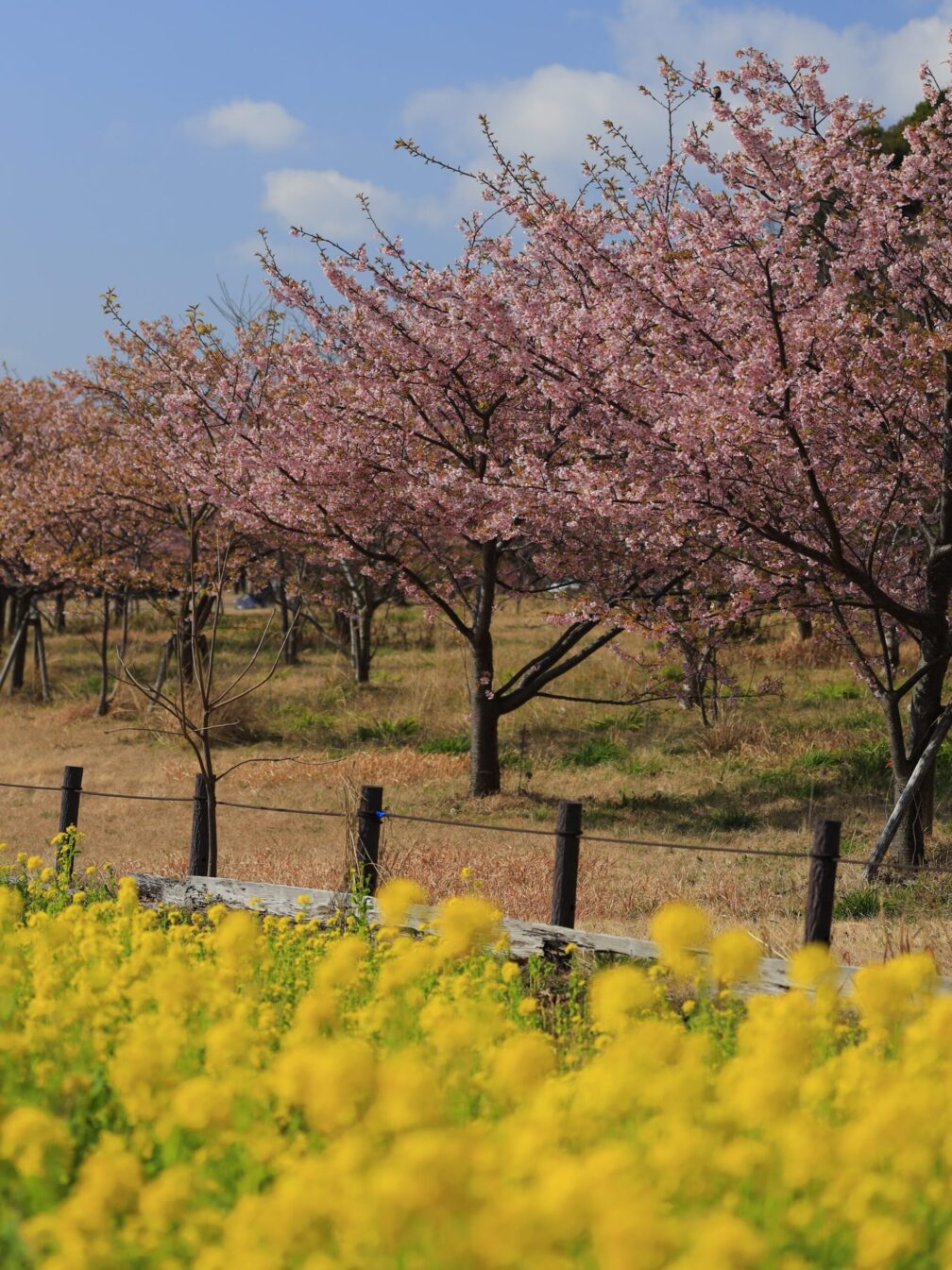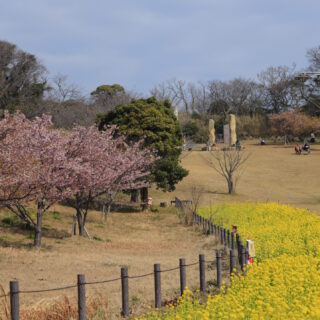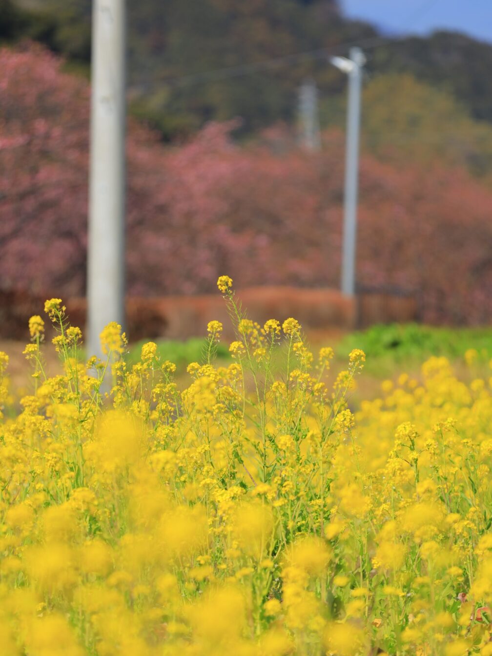 花の広場では菜の花と河津桜が並び、黄色とピンクの春色共演。ちょうど地元のお祭りも行われていて、賑やかな空気。青空の下、のんびりした時間が流れていました。