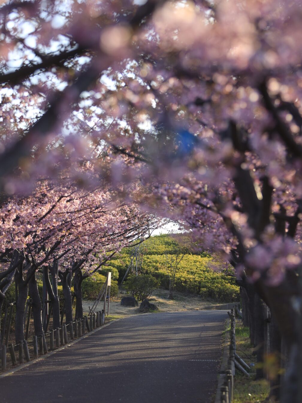まだ空気がひんやりとした朝、少しだけ遅めに出発。なぎさ公園に着くと、河津桜の濃いピンクが朝の青みを帯びた光に浮かび上がっていました。小さな並木道に、柔らかい朝日が斜めに差し込む。その下を散歩する人、犬を連れた方、そして望遠レンズを構える私。完全に浮いています。