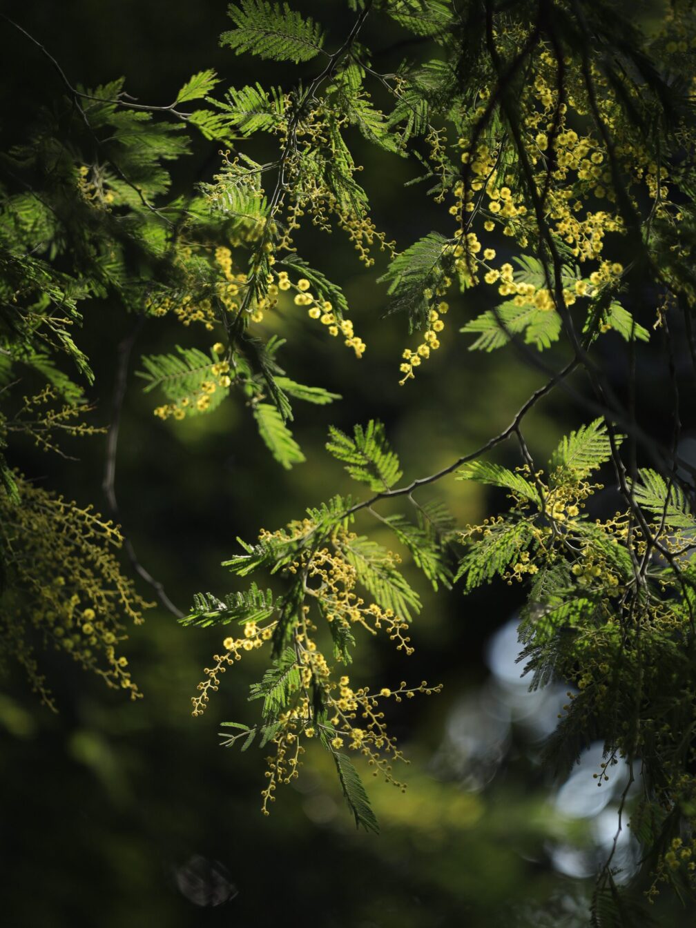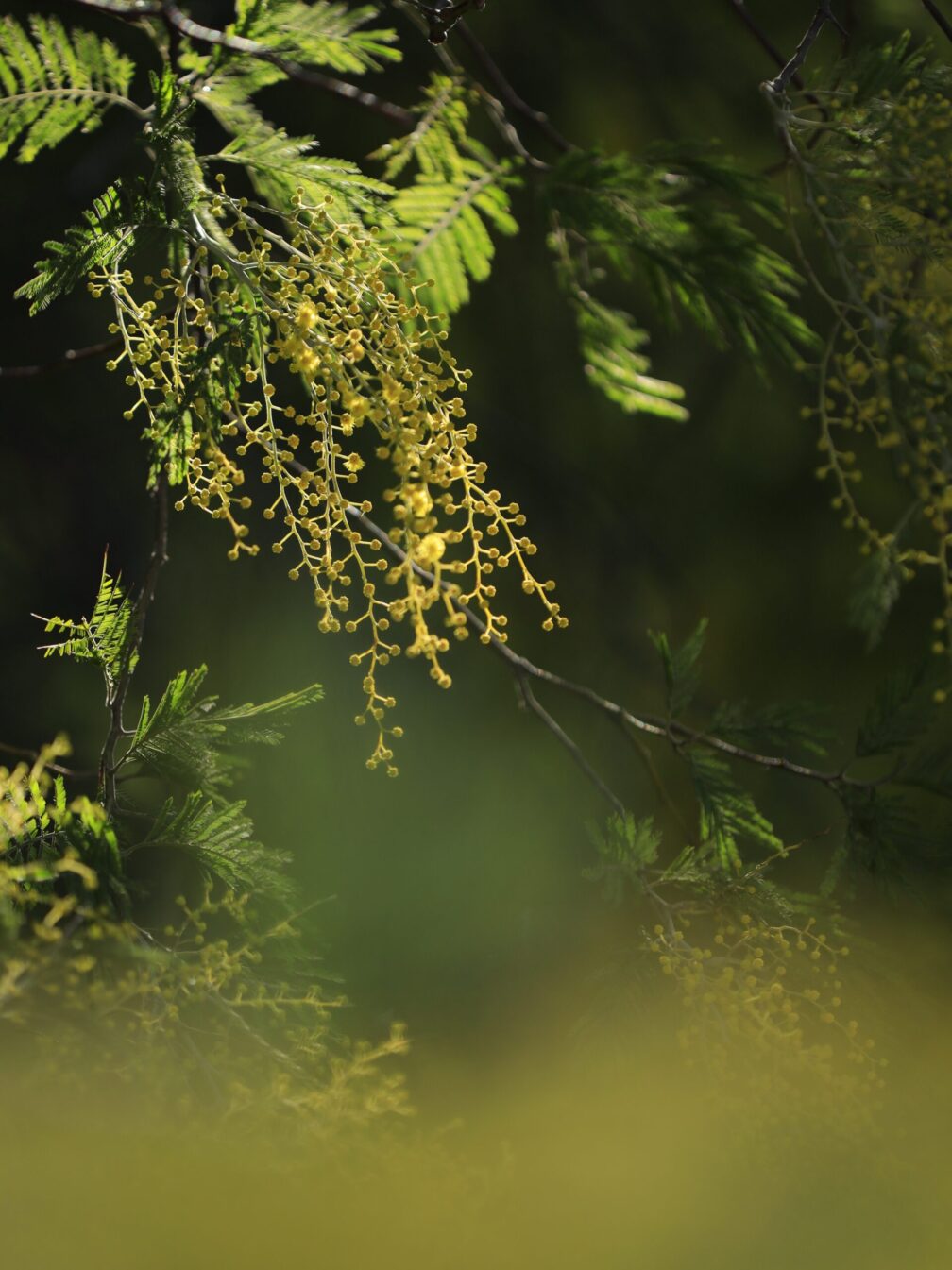 見上げると、ふわふわとした黄色の花が空を覆うように広がっていました。ただ、朝の光はまだ低く、木の片側しか明るくならない。影と光の境界を探しながら立ち位置を微調整。足元を数センチずつ動かす怪しい男。それでも、光がふっと当たった瞬間の黄色は、思わず「おお」と声が出るほど。