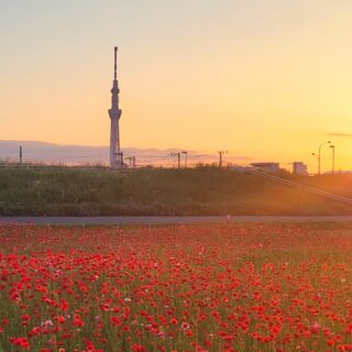 夕日に輝くポピーとスカイツリーが重なる、都会と自然が調和する撮影スポットです。