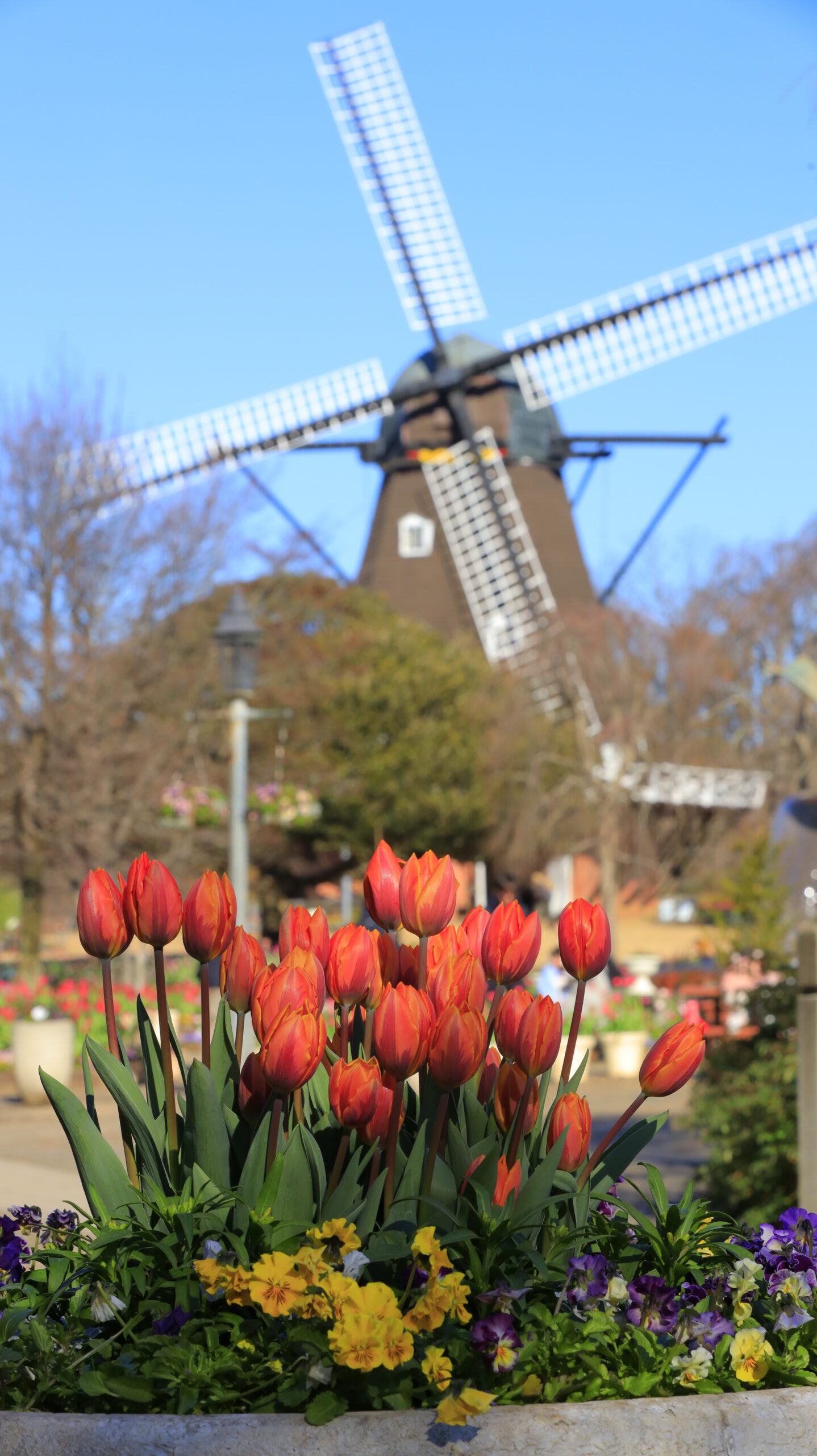 この写真は、ふなばしアンデルセン公園で、オレンジ色のアイスチューリップをメインに、風車がはっきり分かるように撮影したものです。