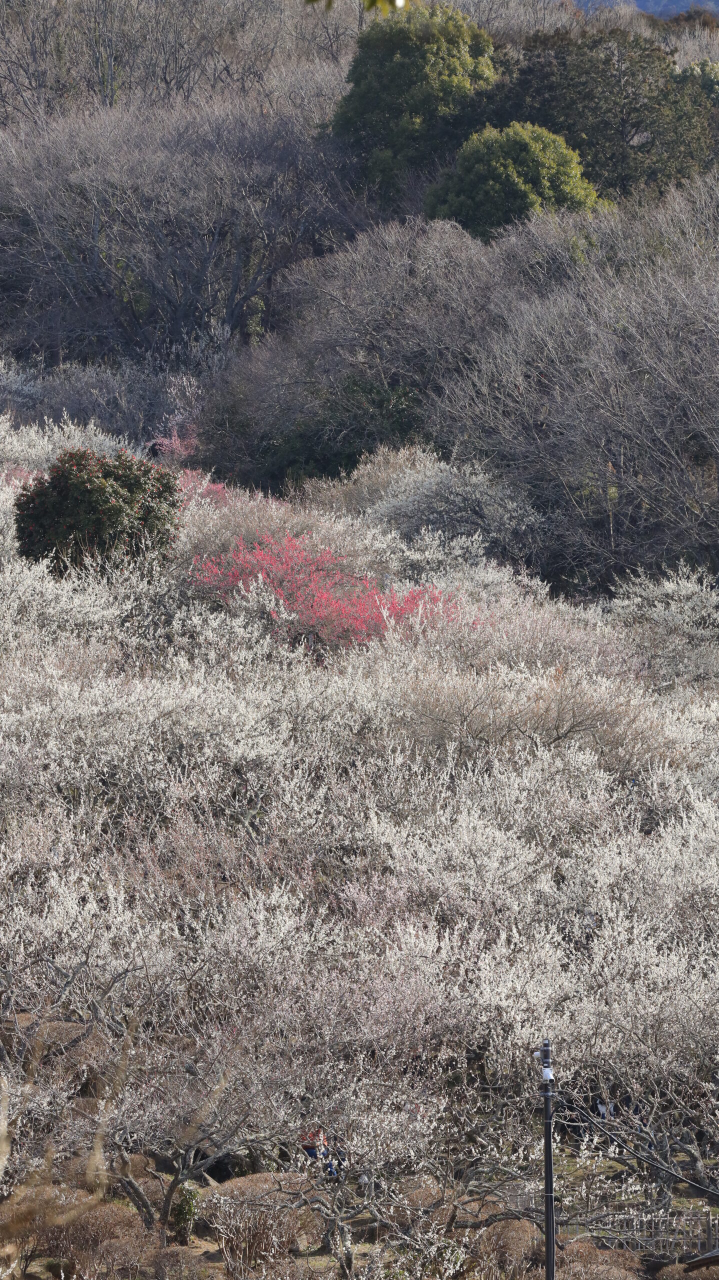 この写真は、筑波山梅林で、白い梅林の中に咲く赤い梅の木に注目して撮影したものです。周囲が白い梅の中で、赤い梅の花がアクセントとなり、色の対比が美しい印象的な風景になっています。