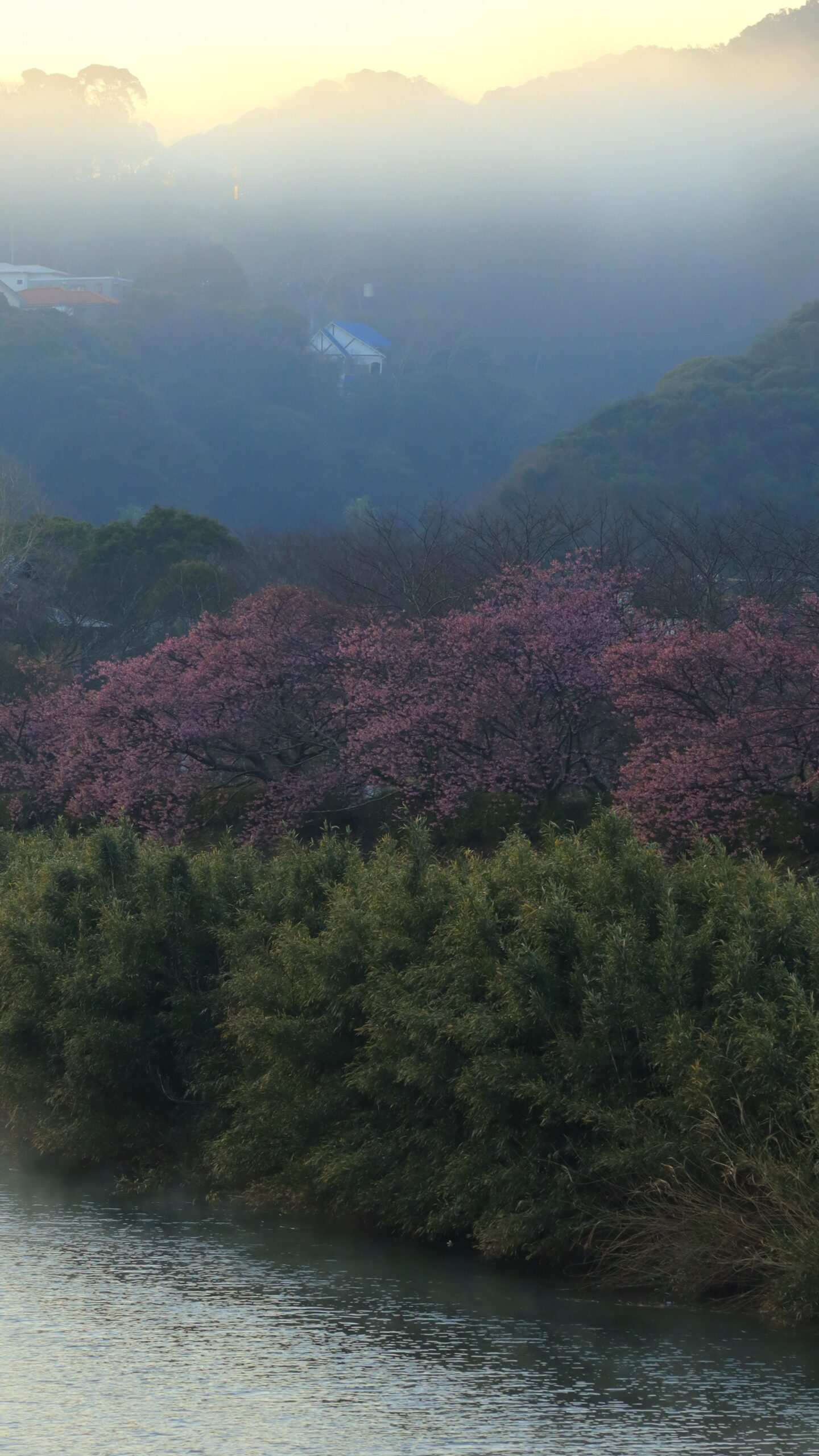 この写真は、みなみの桜と菜の花まつり(南伊豆町)で、日の出直後の青野川沿いに咲く河津桜を撮影したもので、朝の柔らかな光と静けさを大切にしています。