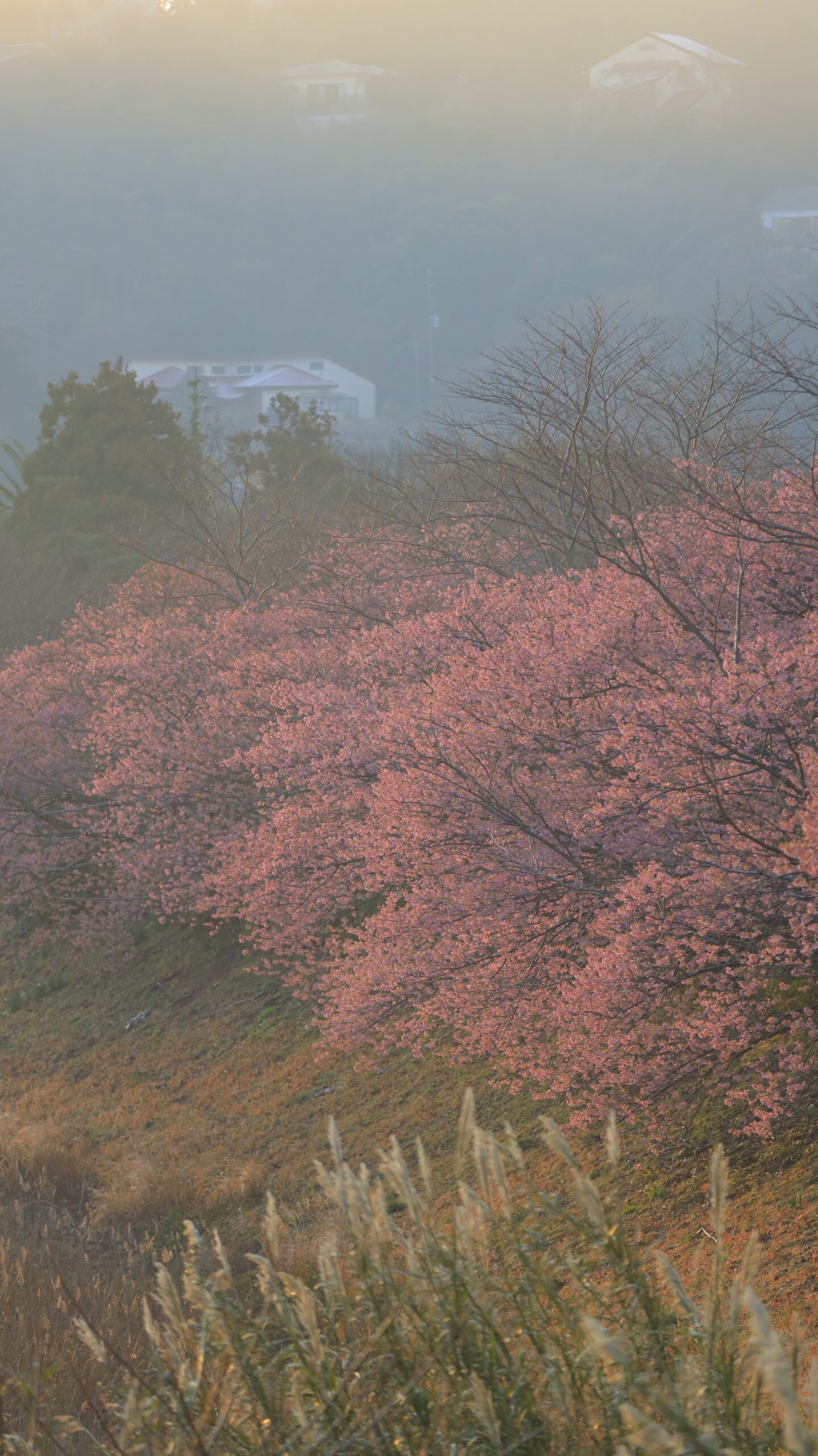 この写真は、みなみの桜と菜の花まつり(南伊豆町)で、少し日が昇った時間帯に朝靄と河津桜を撮影したもので、幻想的な早春の雰囲気を表現しました。