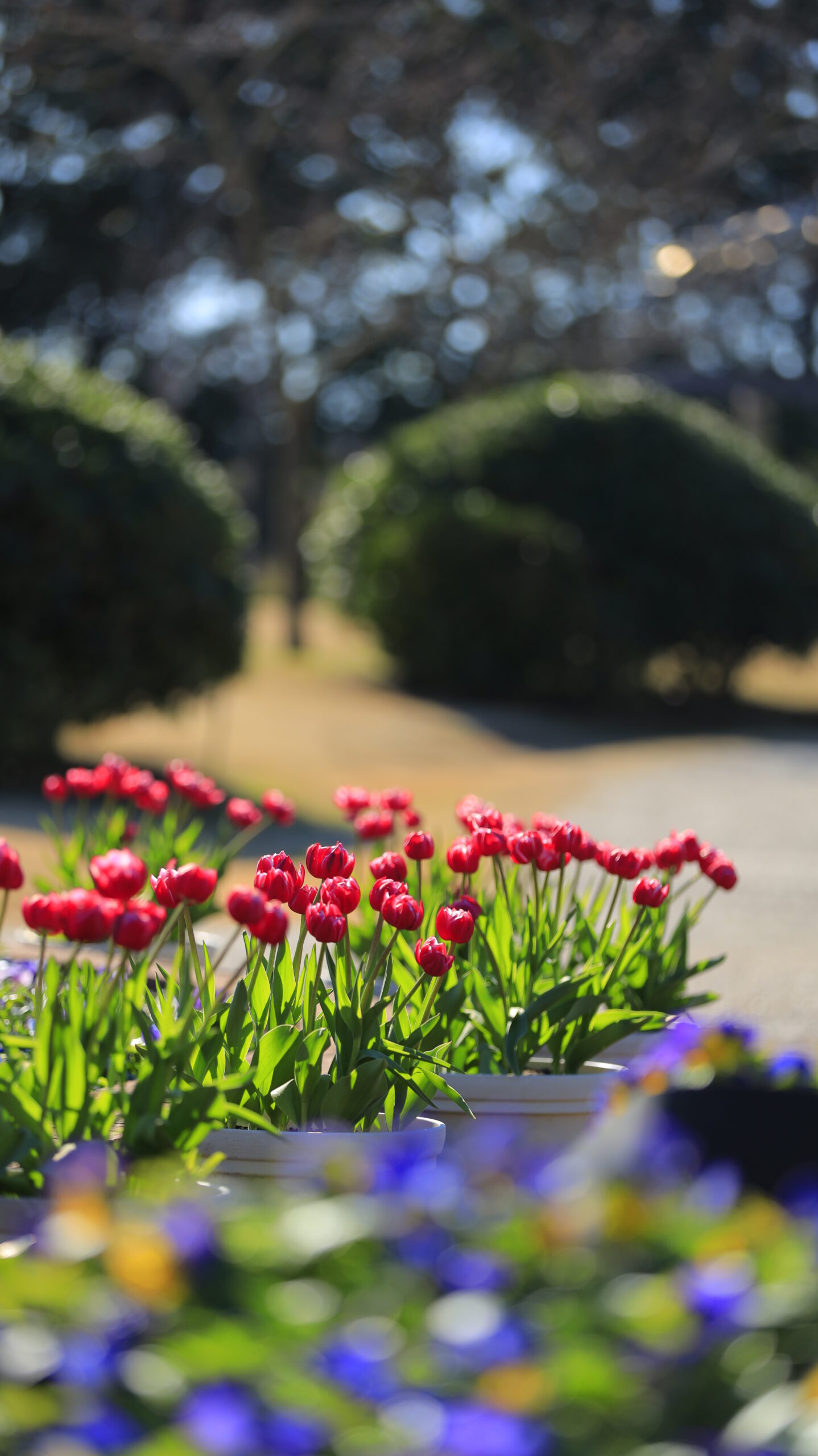 この写真は、ふなばしアンデルセン公園で、真っ赤なアイスチューリップが光を受けてキラキラと輝く様子を撮影したものです。