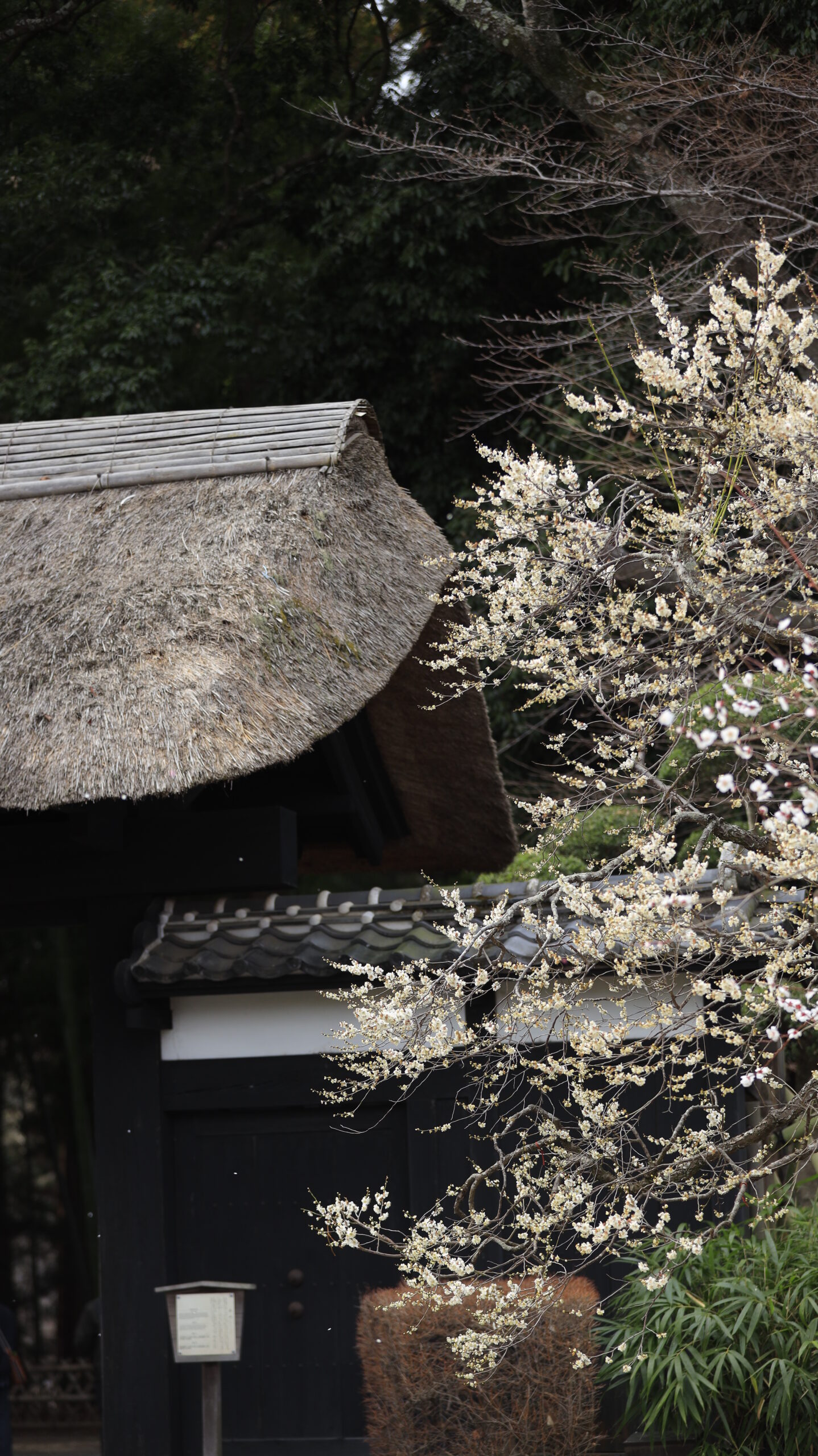 この写真は、偕楽園で、白い梅の木と入口の門を一緒に撮影したものです。歴史ある庭園の門と梅の花が組み合わさり、偕楽園らしい風情のある景色を感じられる構図になっています。